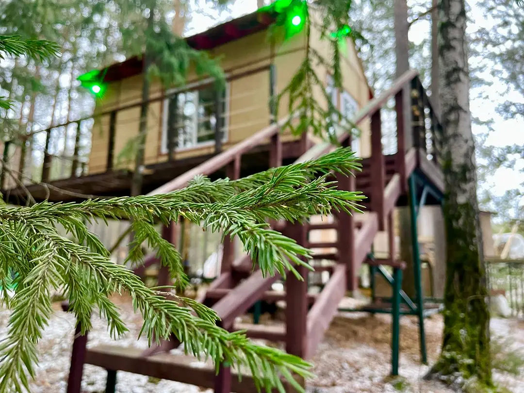 Домик выполнен в эко стиле. С большой панорамной террасой. Стоит на сваях на высоте 3 метров, соприкасаясь с ветвями деревьев. Вечером окружающий лес подсвечивается изумрудным светом, создавая атмосферу сказочной романтики.