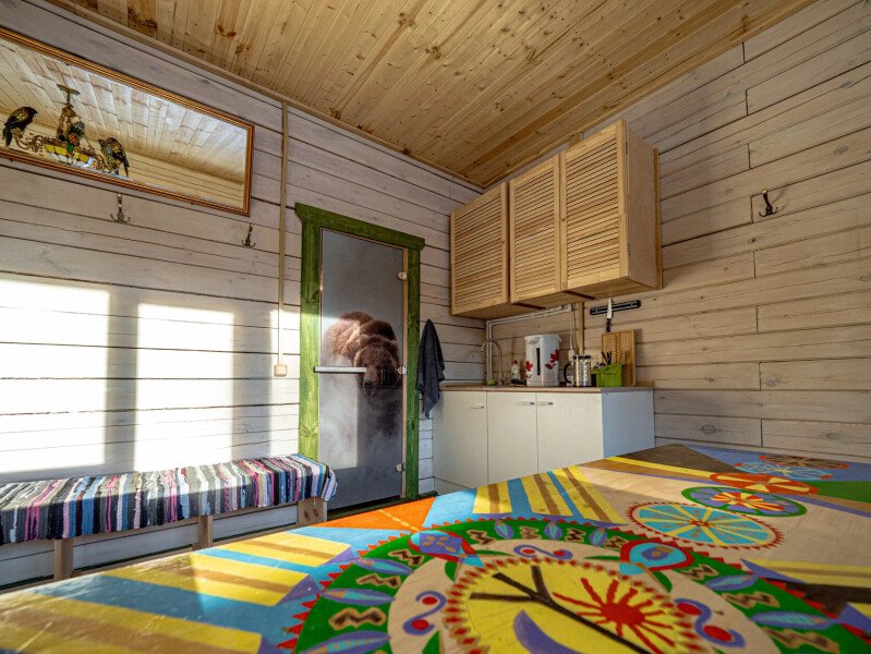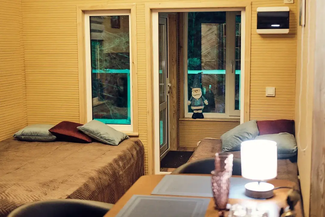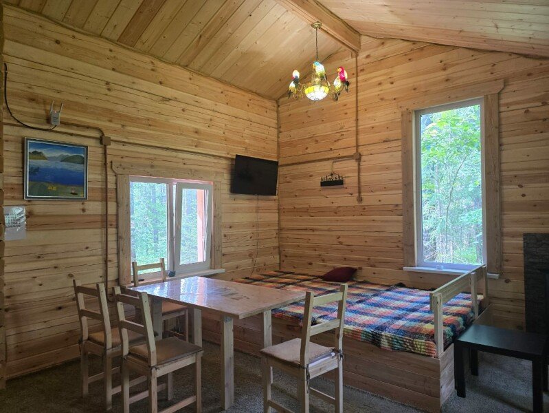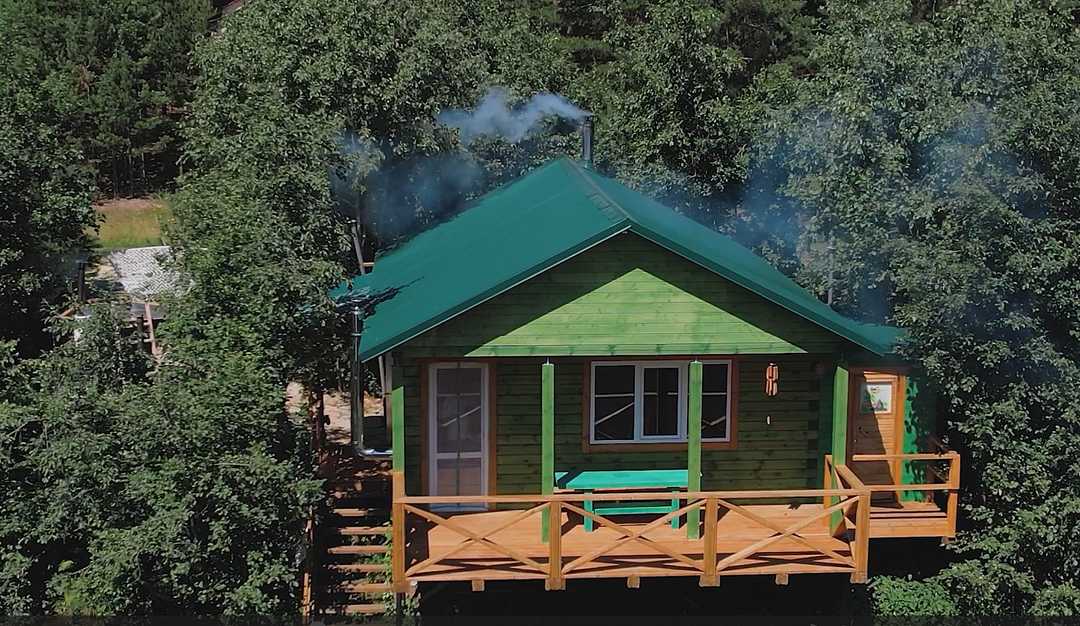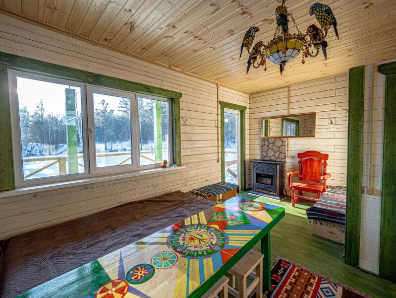 Домик выполнен в эко-стиле из сибирского кедра. Внутри пахнет свежим деревом, а кругом хвойный лес. Большой Иранский камин создаёт атмосферу тепла и уюта. Вечером окружающий лес подсвечивается изумрудным светом, погружая в самое сердце сказки.