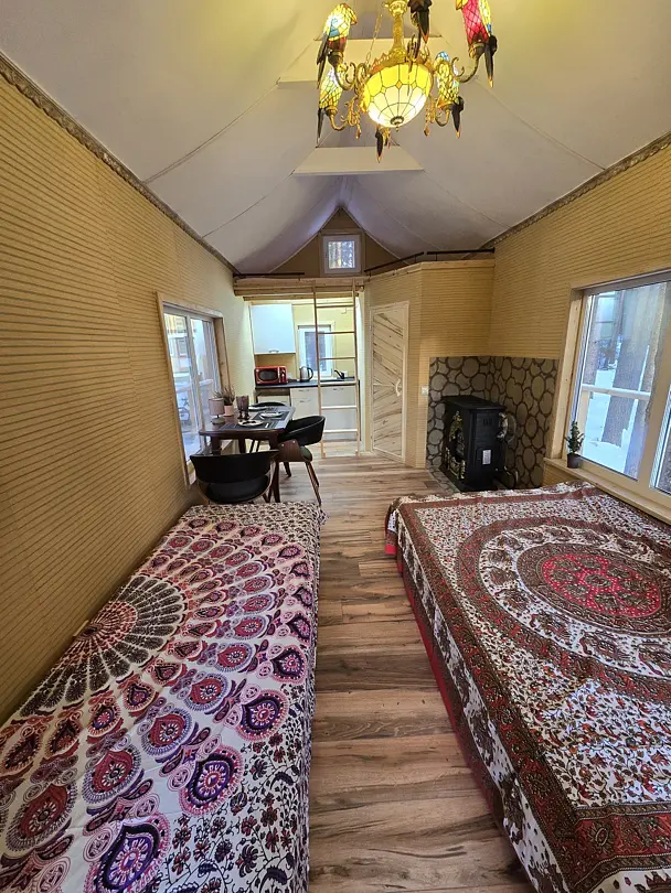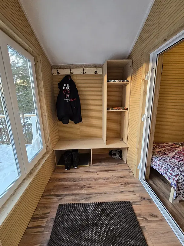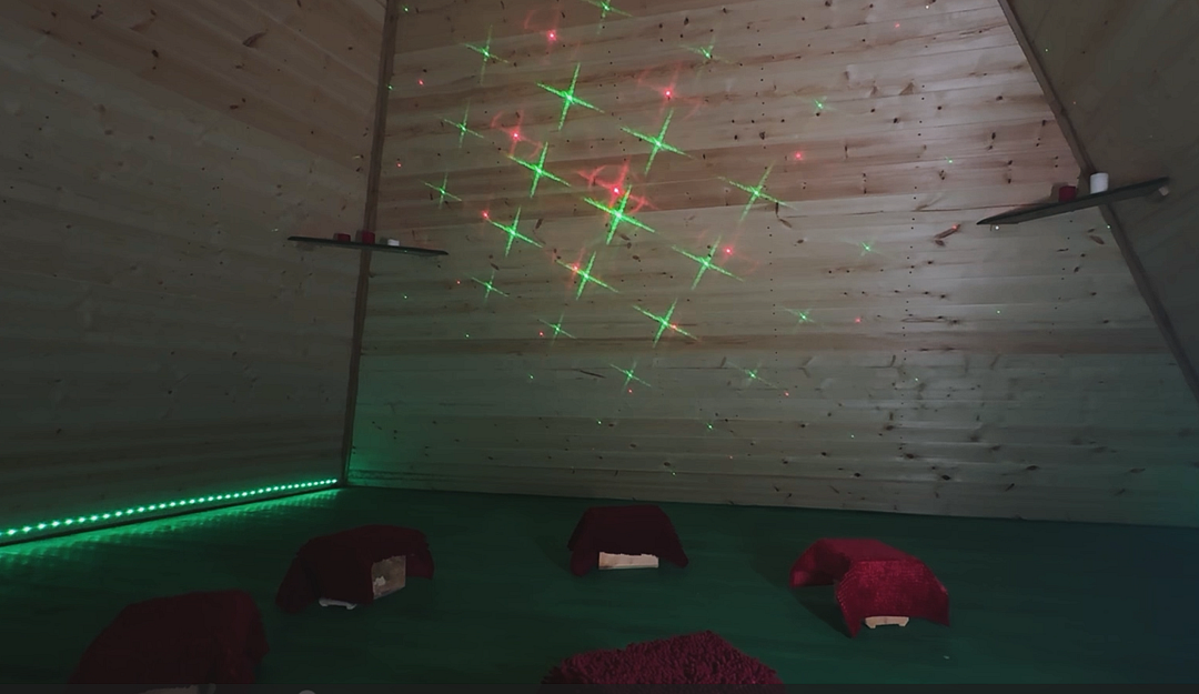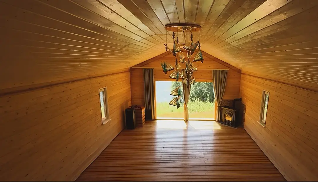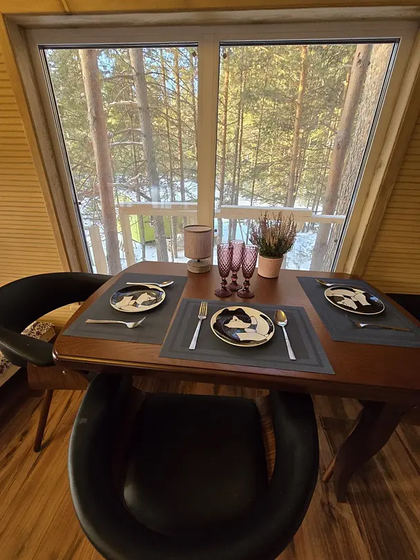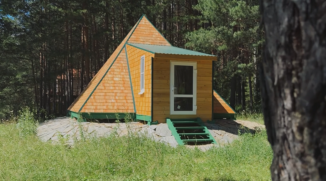 Домик выполнен в эко-стиле из сибирского кедра. Внутри пахнет свежим деревом, а кругом хвойный лес. Большой Иранский камин создаёт атмосферу тепла и уюта. Вечером окружающий лес подсвечивается изумрудным светом, погружая в самое сердце сказки.