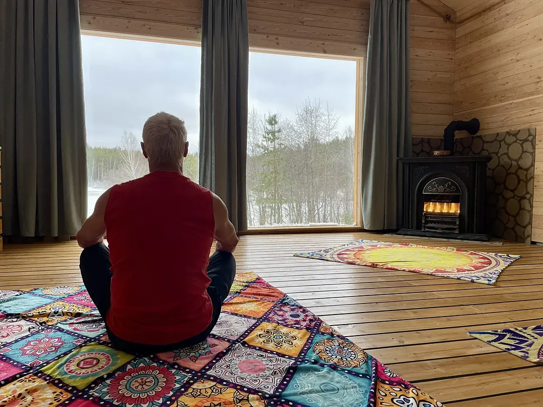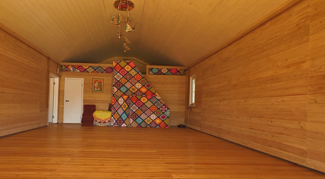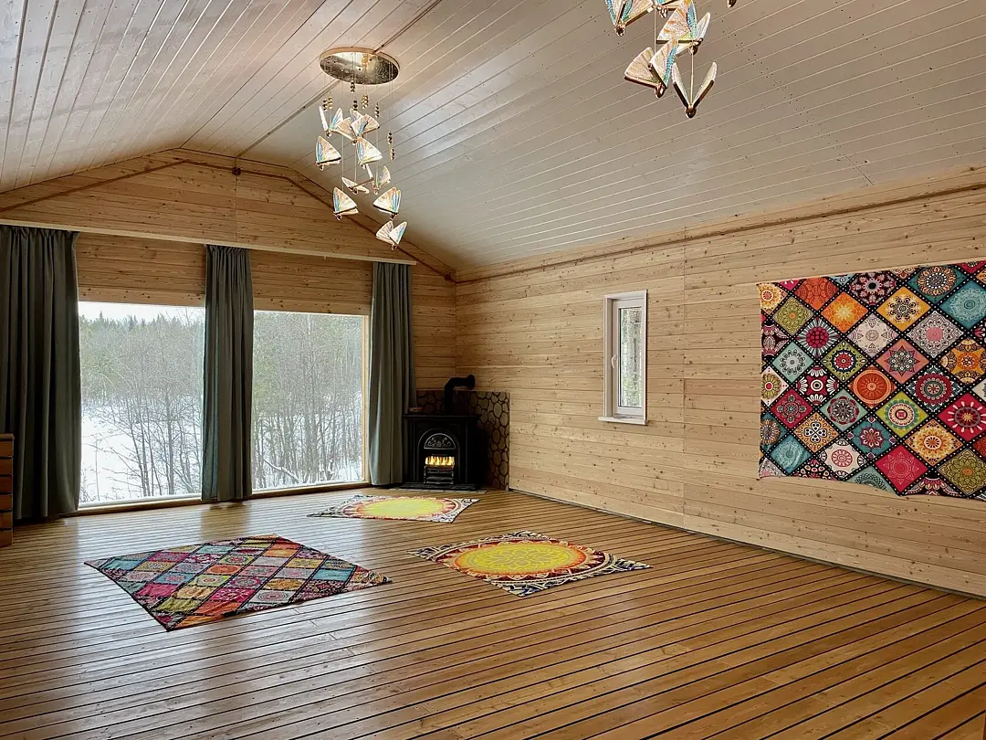 Для проведения занятий, мастер-классов, йога-ретритов и обучающих программ на территории оборудован уютный зал с панорамным видом на пруд. Пространство наполнено спокойствием и светом, создавая вдохновляющую атмосферу для творчества и саморазвития.