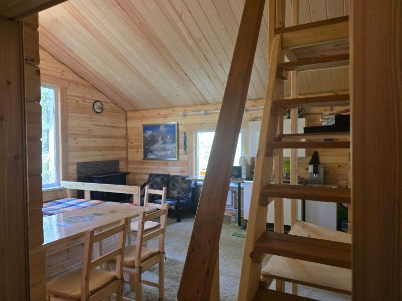 Большая кухня-гостинная с плитой, чайником и микроволновкой, санузел с ХВС, ГВС, унитазом и душевой кабиной, спальня на мансарде.