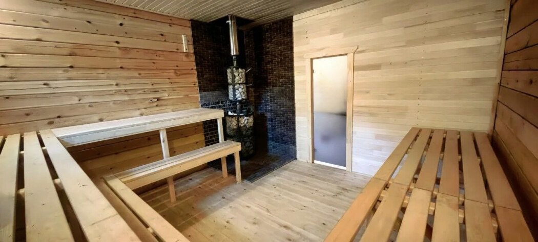 Вас ждет аромат свежего дерева, камин, кухня, большой обеденный стол, а за дверью парная с сухим паром для прогрева или влажным паром для парений.
