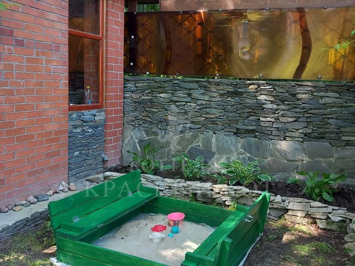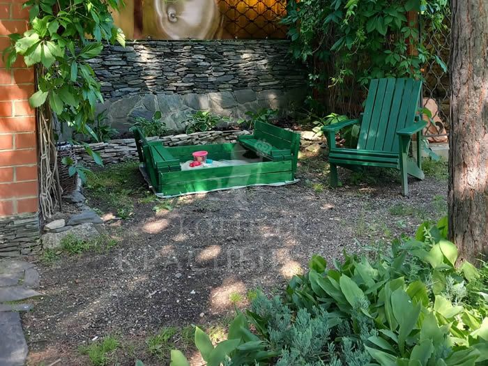 На территории коттеджа расположена крытая беседка с мангалом. В беседке — стол, скамейки, кирпичный мангал.