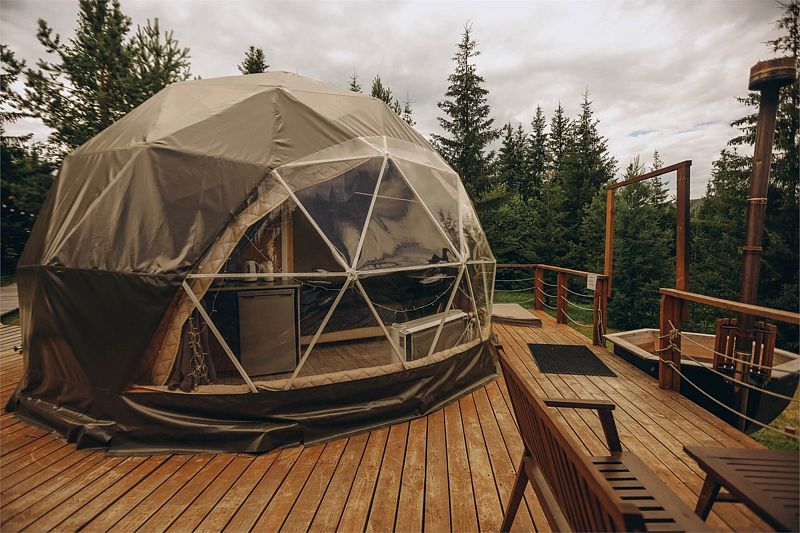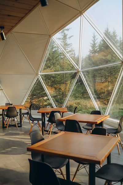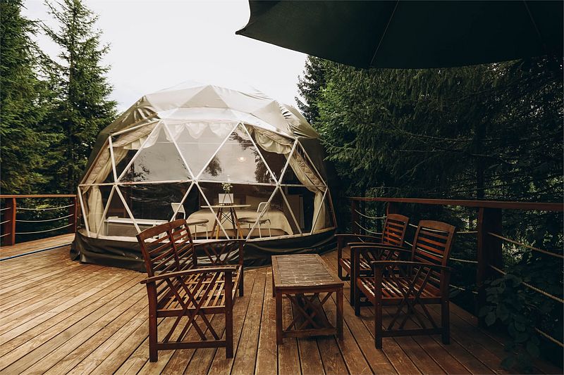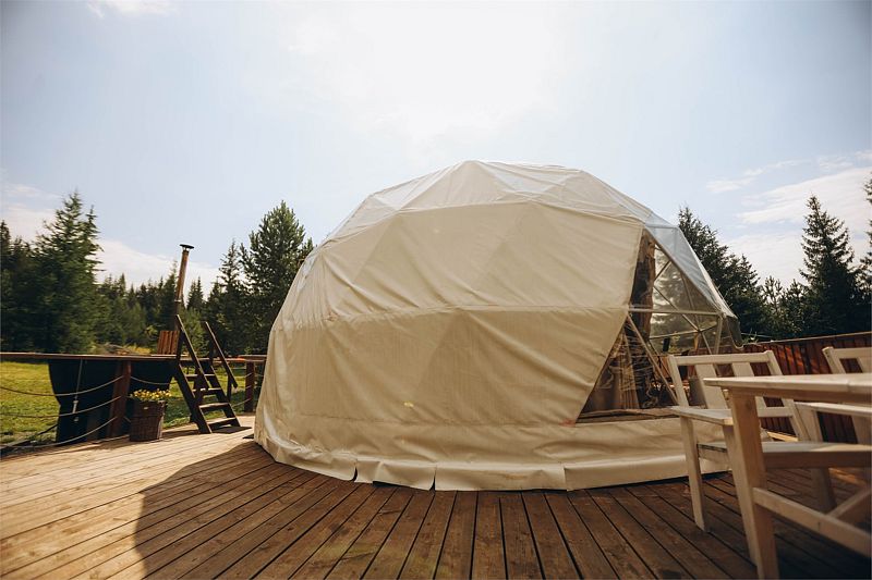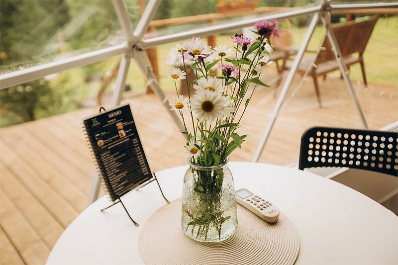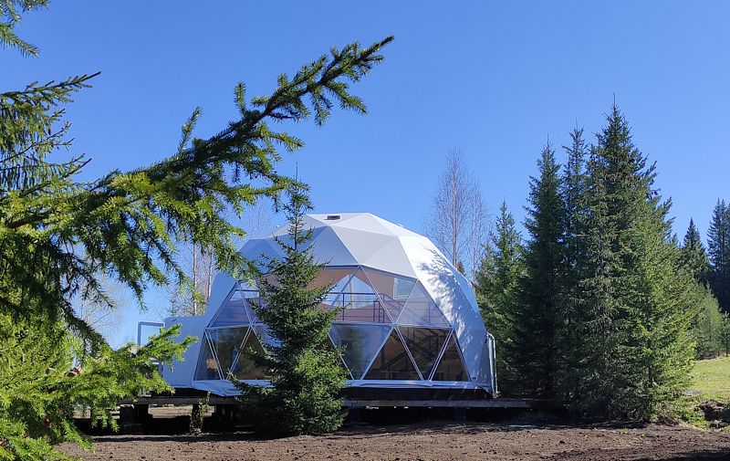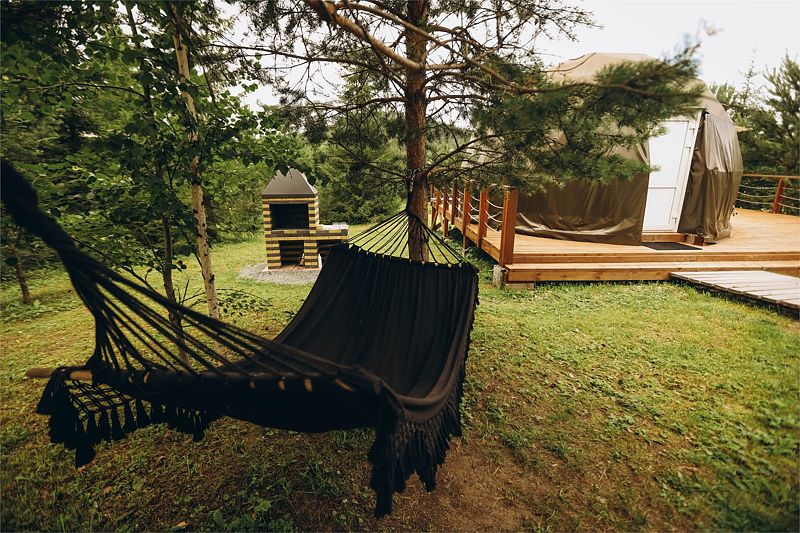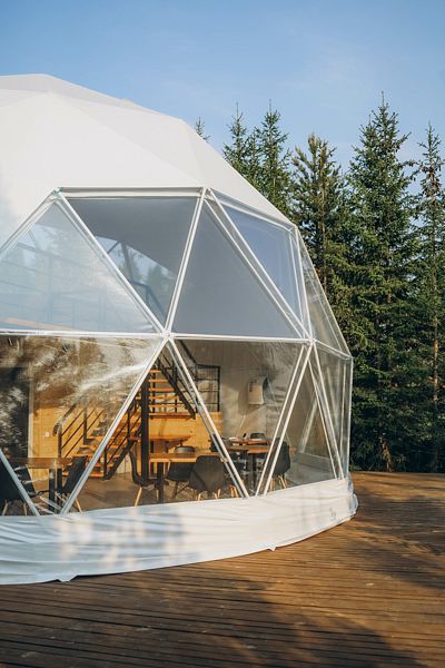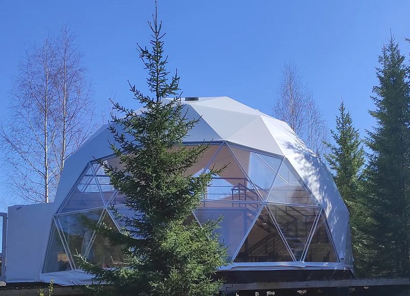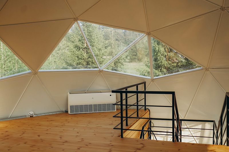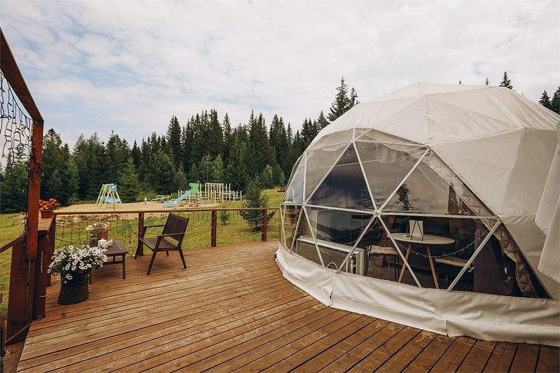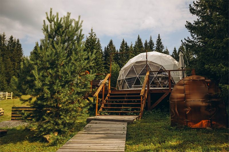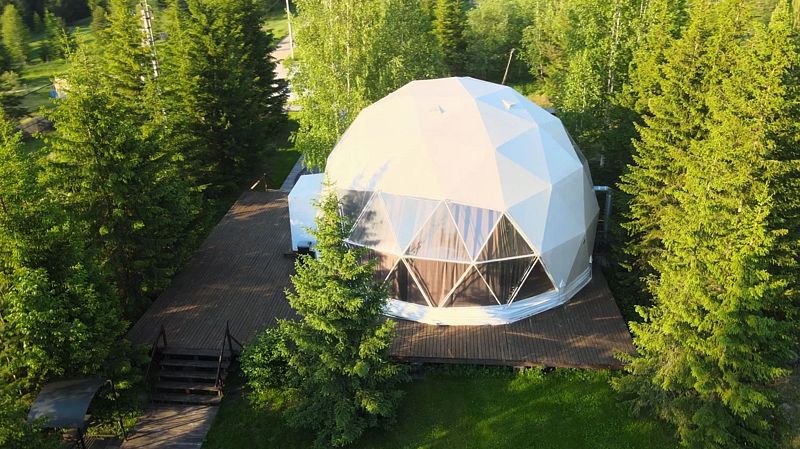 Большой купольный шатер (до 30 гостей) расположен в живописной локации с видом на лес.