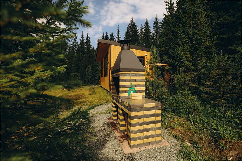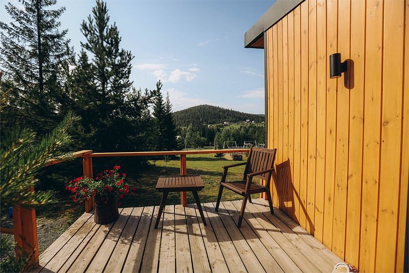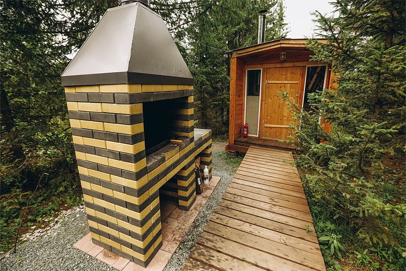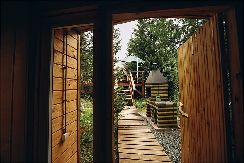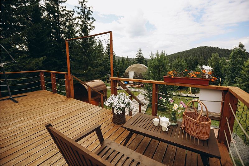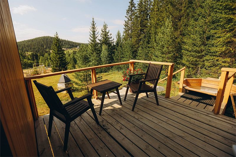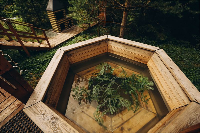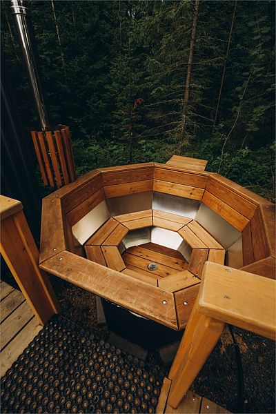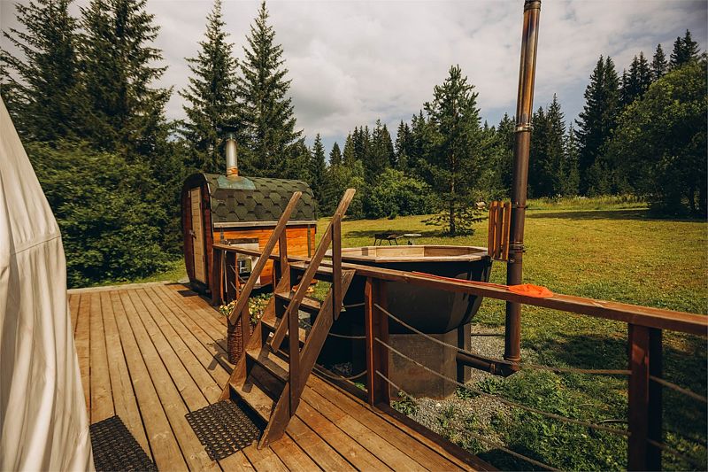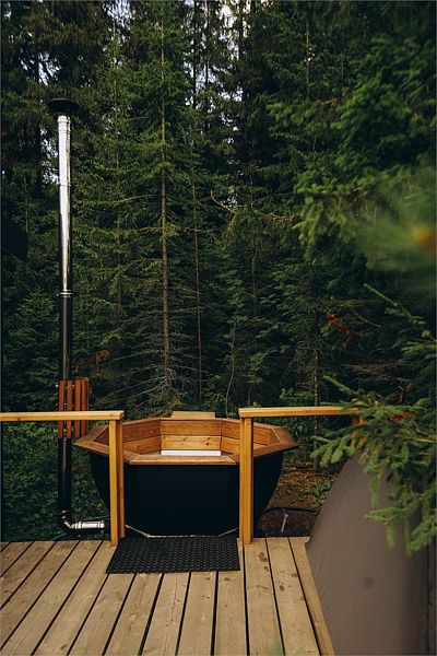 Шатер в окружении леса, с собственным чаном и баней на террасе.