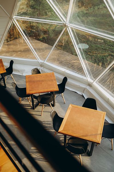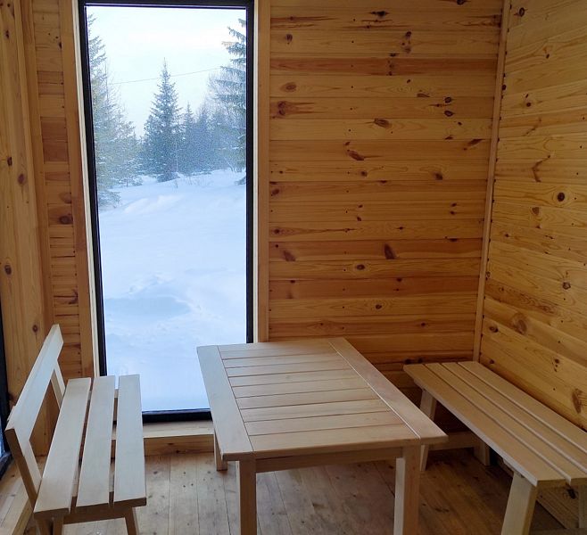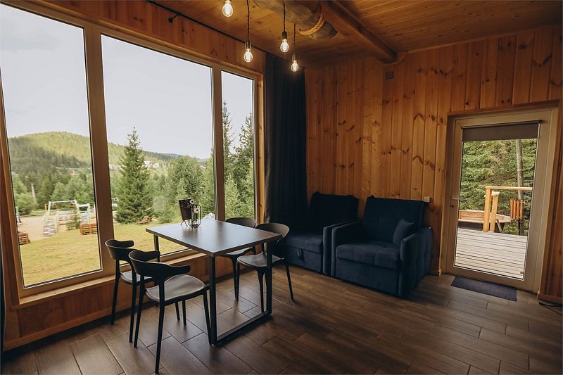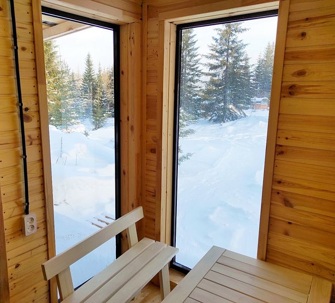 Шатер с обеденной зоной перед панорамным окном, с собственным чаном и баней на террасе.