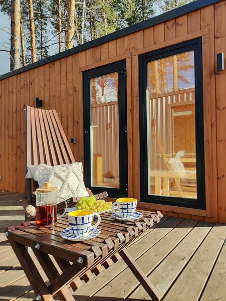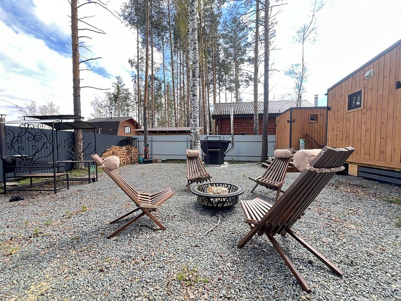 В вашем распоряжении — дом с панорамными окнами, наполненный светом и теплом, и уютная дровяная баня с отдельной комнатой для отдыха. Для того чтобы создать атмосферу безмятежности, на просторной деревянной террасе можно устроить чаепитие в шезлонгах или развести костер в специально отведенной зоне. Кроме того, здесь есть мангальная площадка для приготовления барбекю, чан для релаксации и закрытая территория с комфортной парковкой.