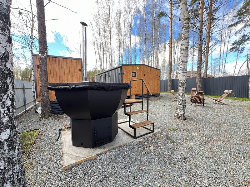 Банный чан расположен в непосредственной близости от дома и русской бани, что позволяет наслаждаться процедурами на свежем воздухе, наслаждаясь окружающей природой.
