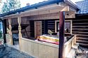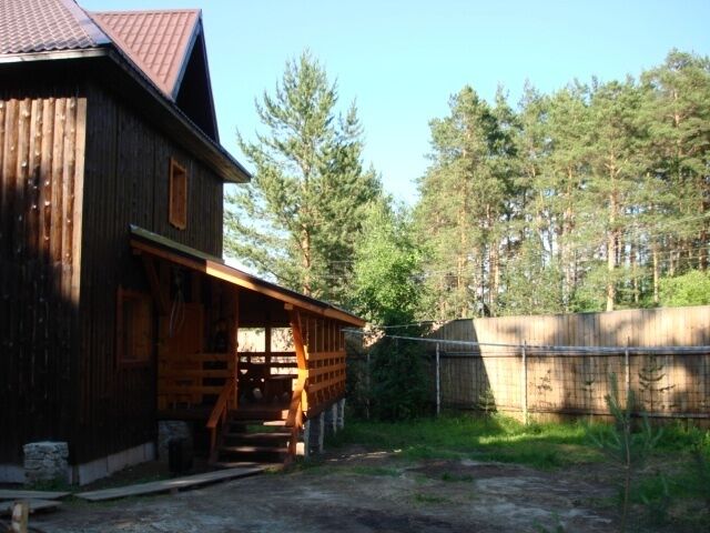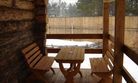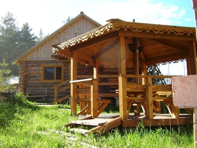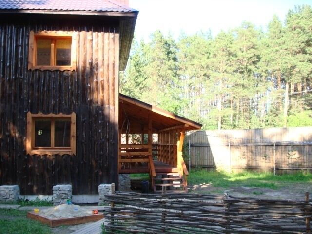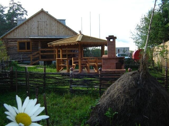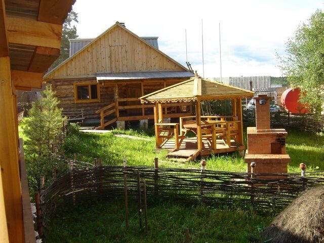 Рядом есть костровище, а у самого домика есть веранда и своя территория, на которой находится детская площадка и мини-зоопарк для детей.