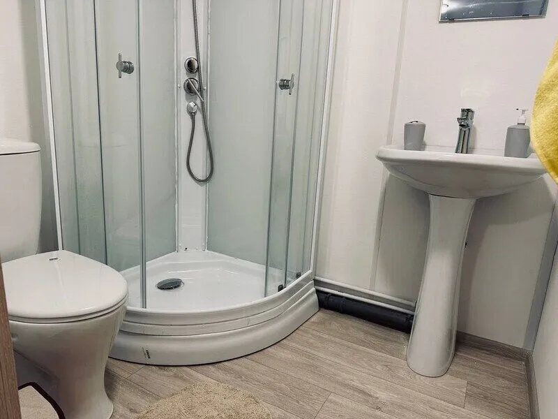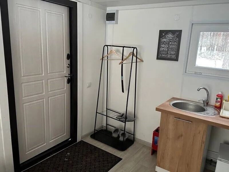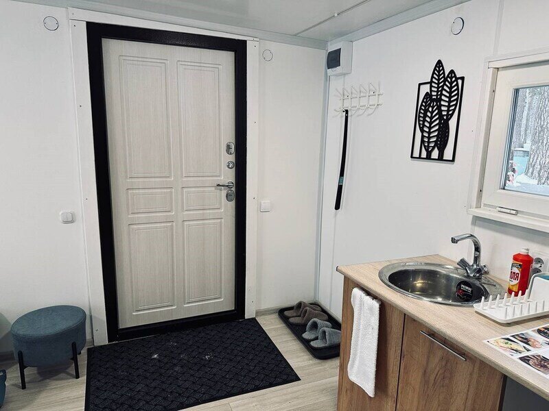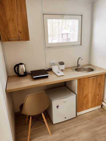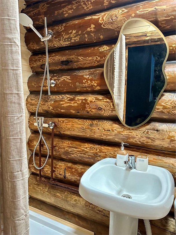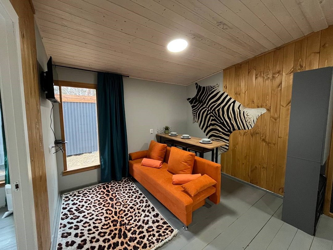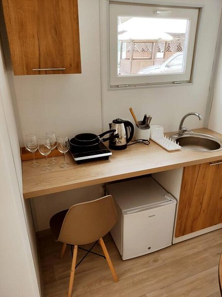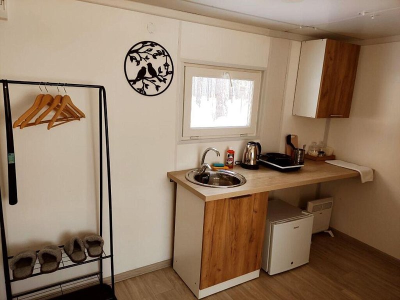 В домике 1 спальня с большой двуспальной кроватью. Гостиная совмещена с зоной кухни со всем необходимым для приготовления пищи. Санузел с душевой кабиной.