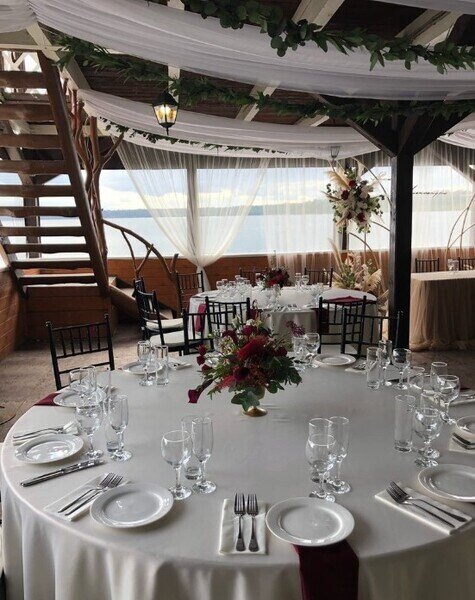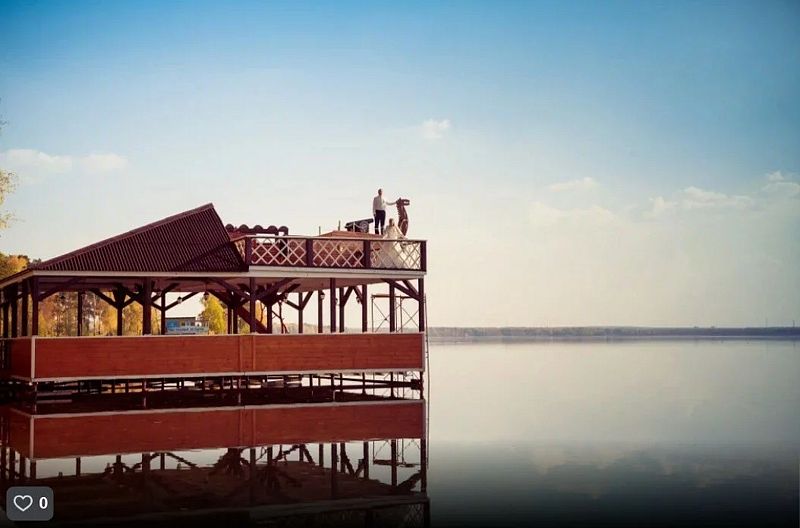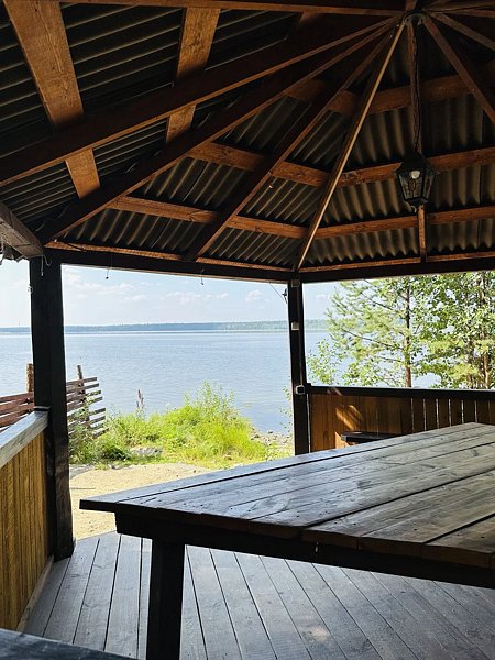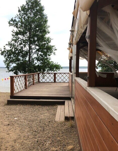 Двухэтажная веранда на воде с панорамным видом на озеро вмещает гостей при полной посадке до 70 человек, фуршет до 100 человек.