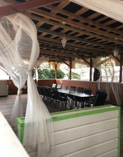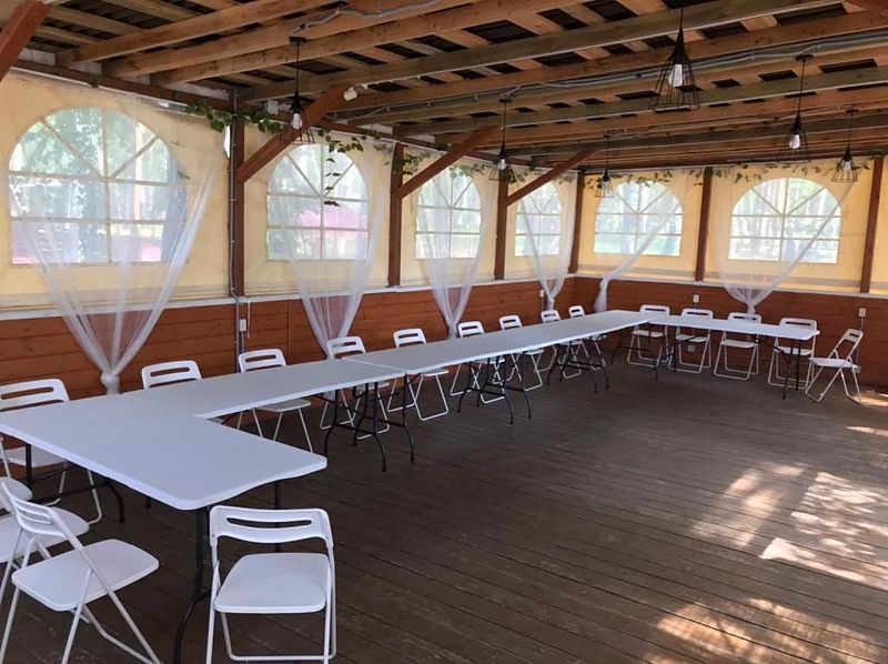 В стоимость аренды входит: веранда с огороженной территорией, банкетная мебель (круглые столы и стулья), этажерки под сумочки, столик для ведущего, большой мангал.