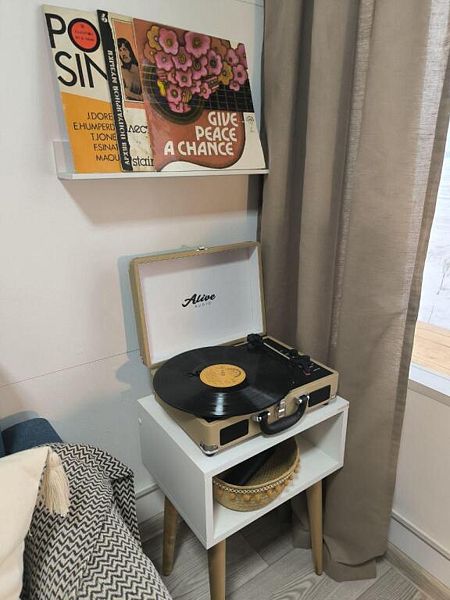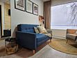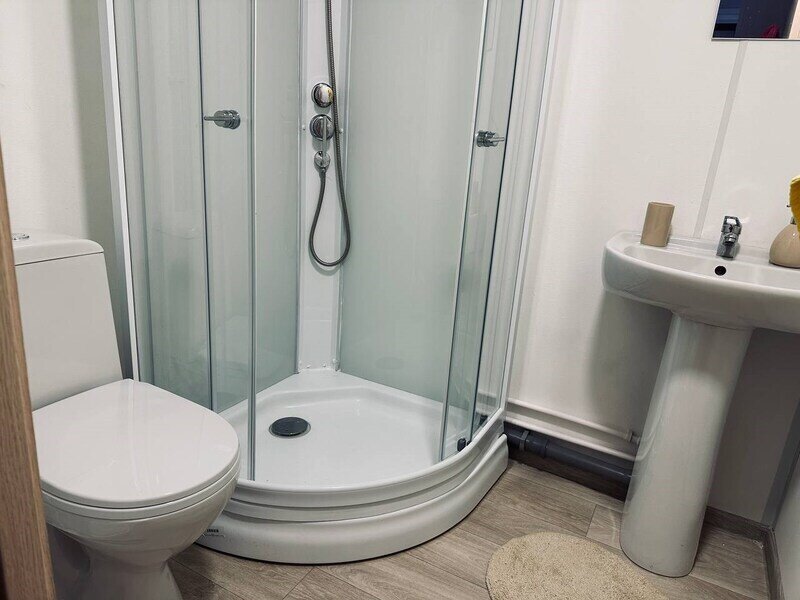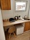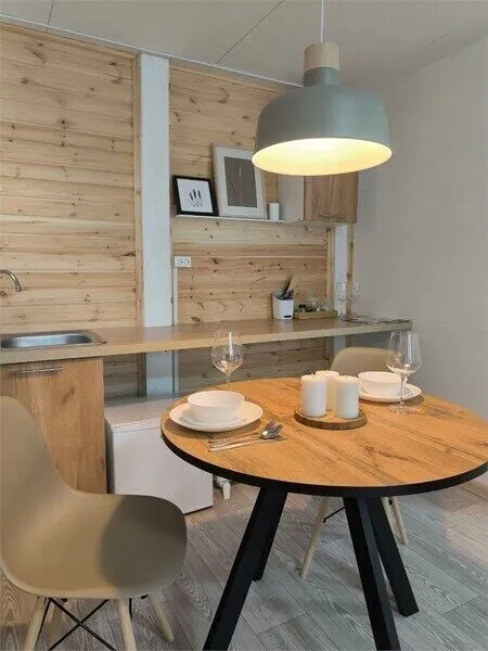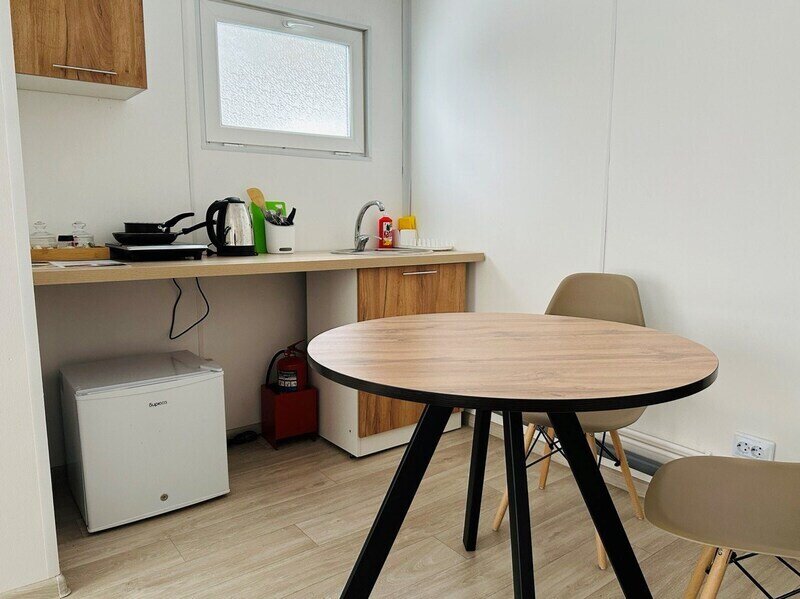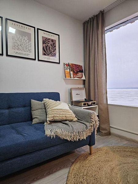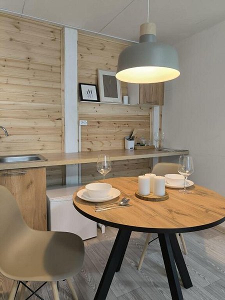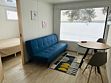 - гостиная с диваном, совмещенная с полностью оборудованной кухней, изолированная спальня с двуспальной кроватью, санузел с душевой кабинкой.