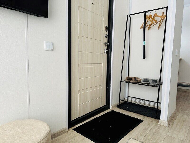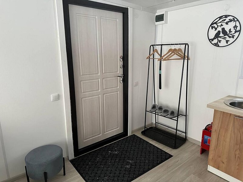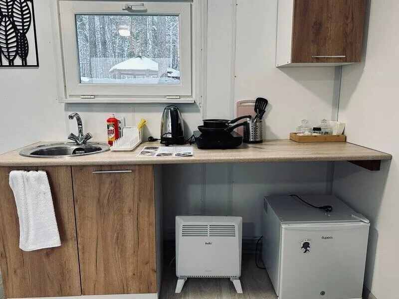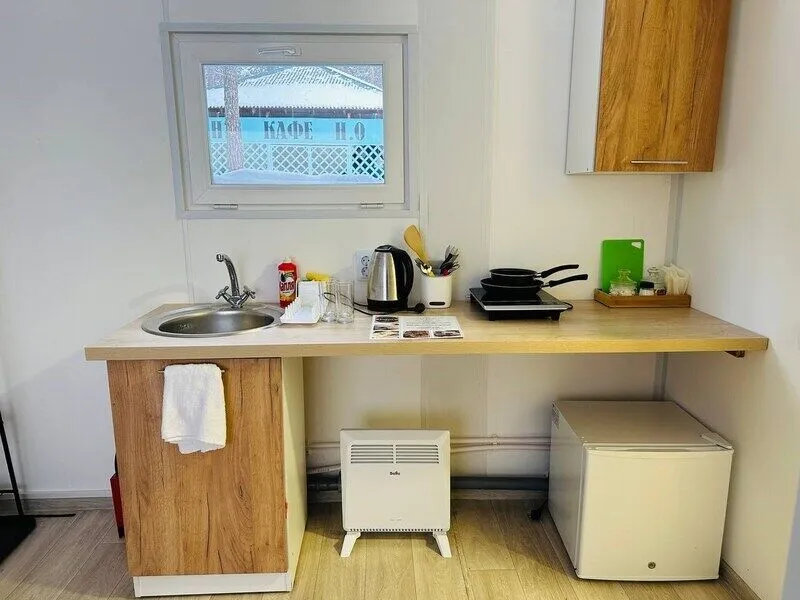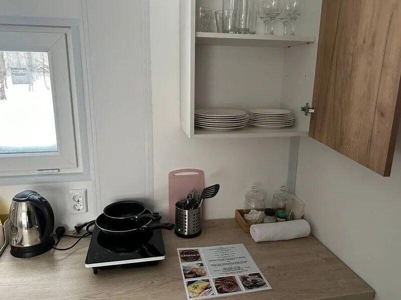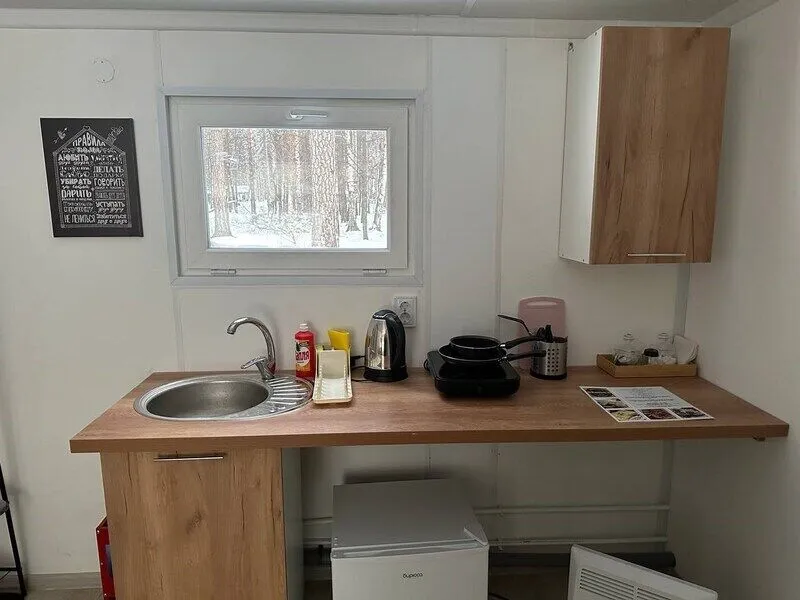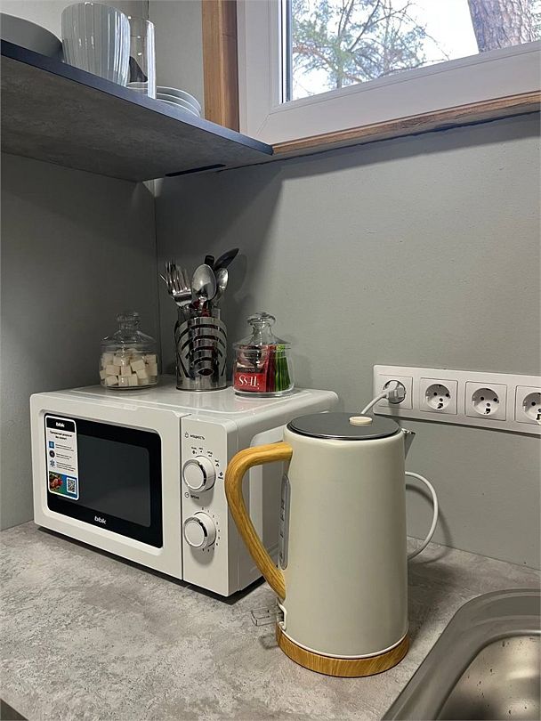 - Кухонное оборудование: холодильник, СВЧ, электрочайник, полный набор посуды, столовых приборов, кухонных принадлежностей.