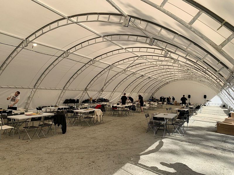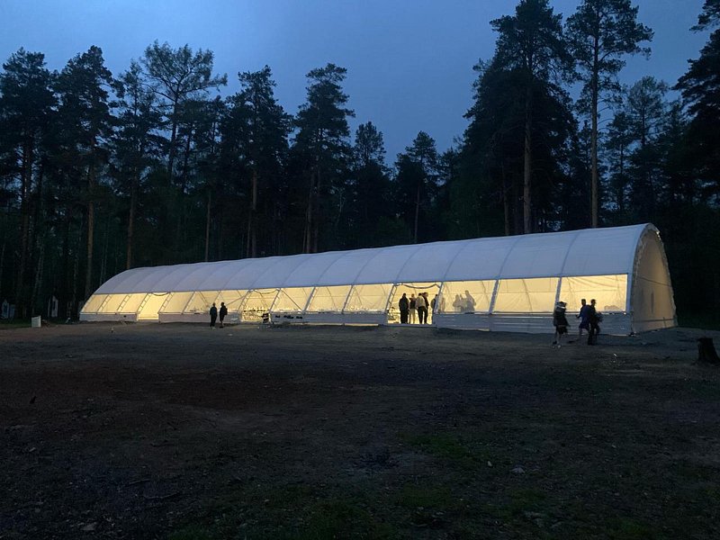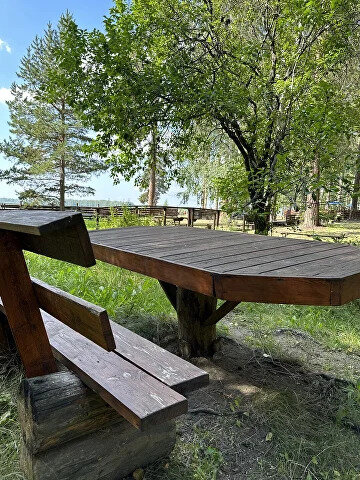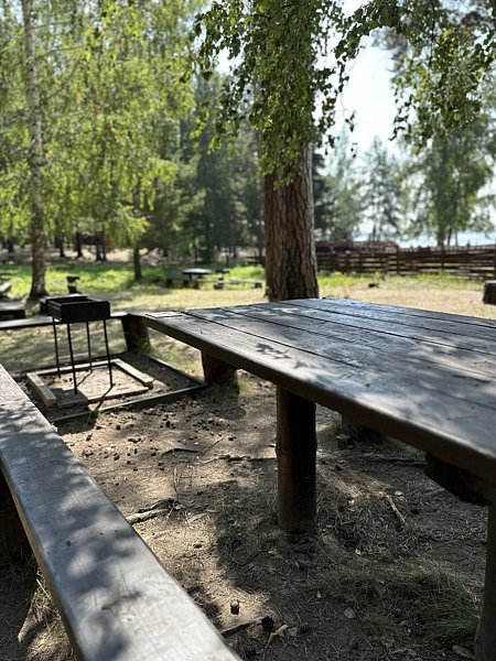 Шатер с мебелью (столы и стулья), окнами и шторами, огороженной территорией и выходом к озеру. На территории — большой мангал.