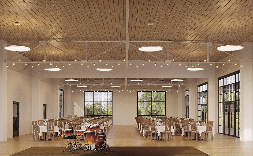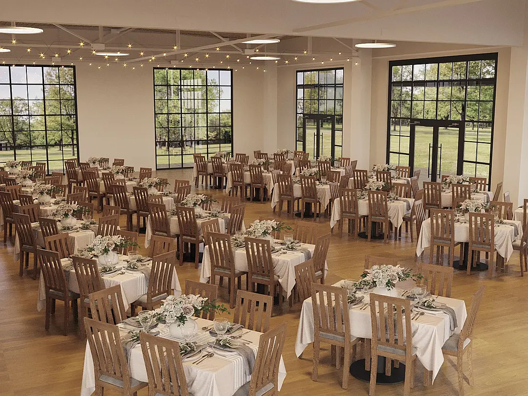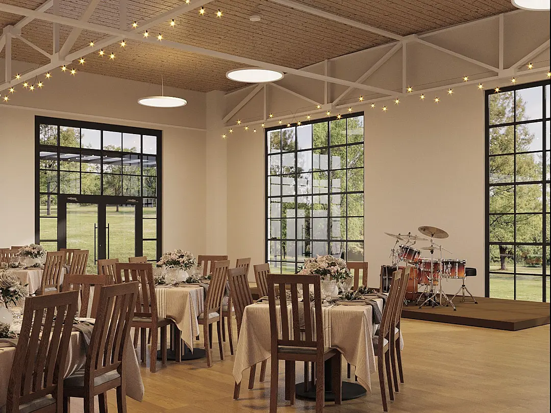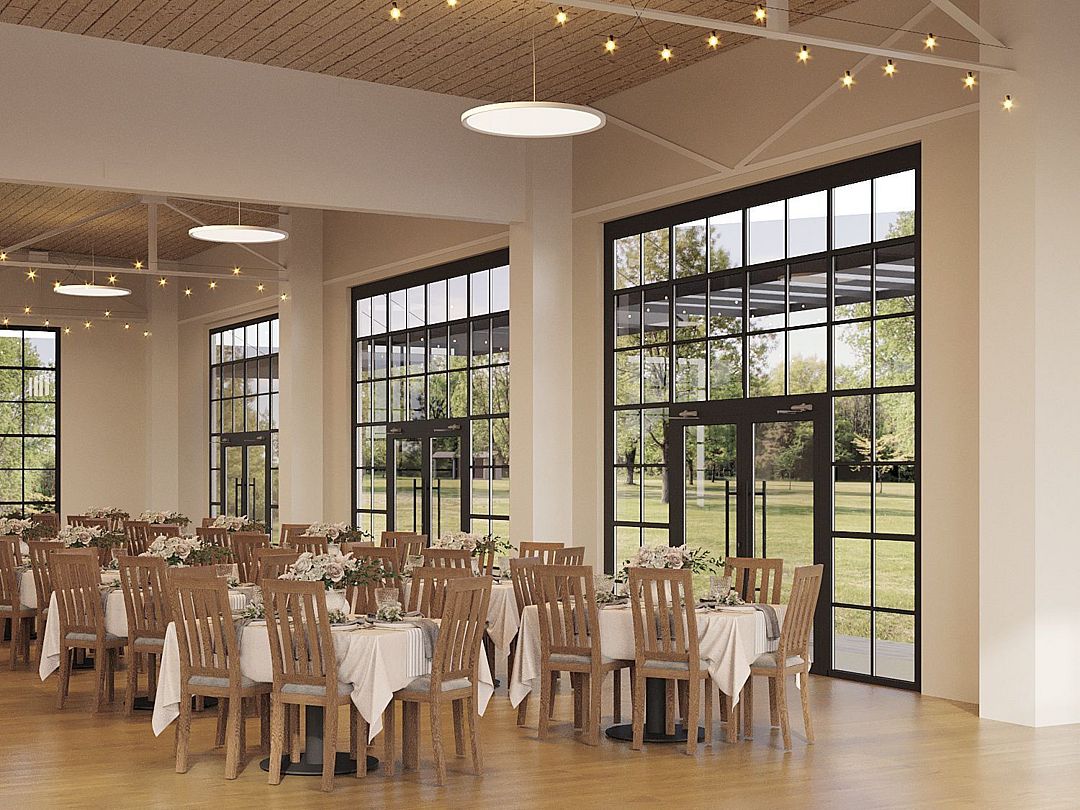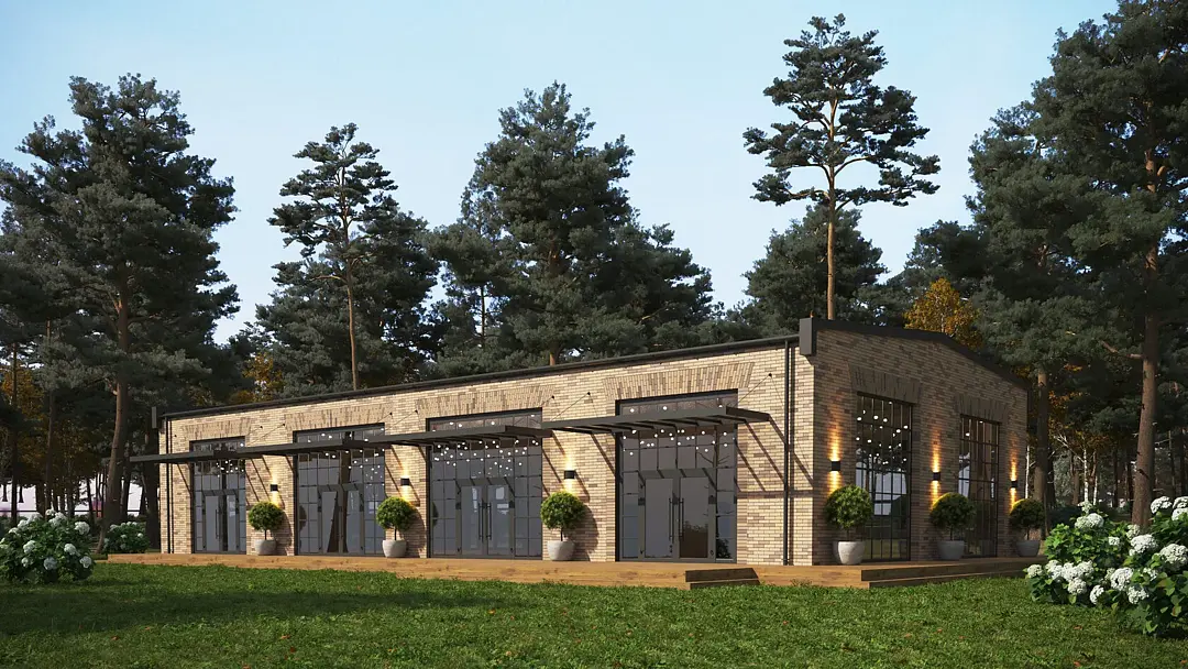 На первом этаже основное пространство с банкетной мебелью, на втором этаже открытая веранда с чилаут зоной. Огороженная территория с большим пространством для активностей на улице. Отлично подходит для выездной регистрации или тимбилдинга.