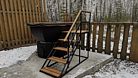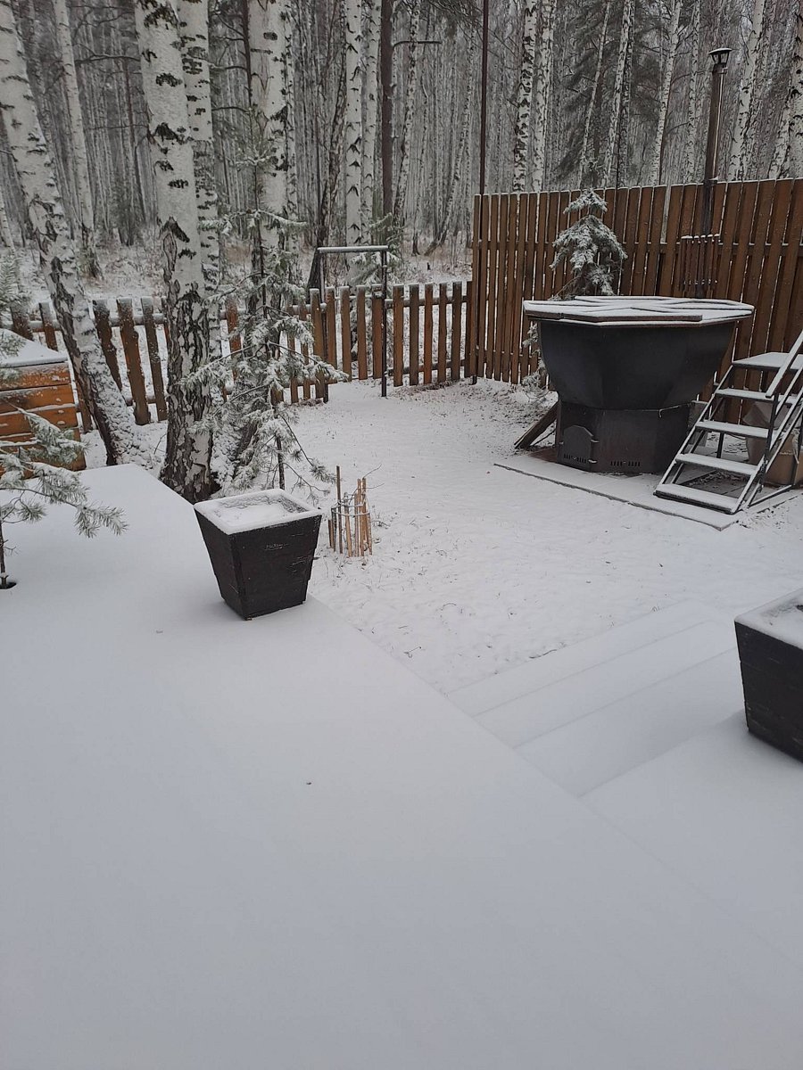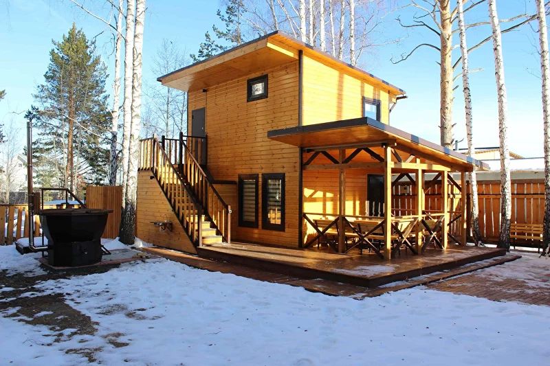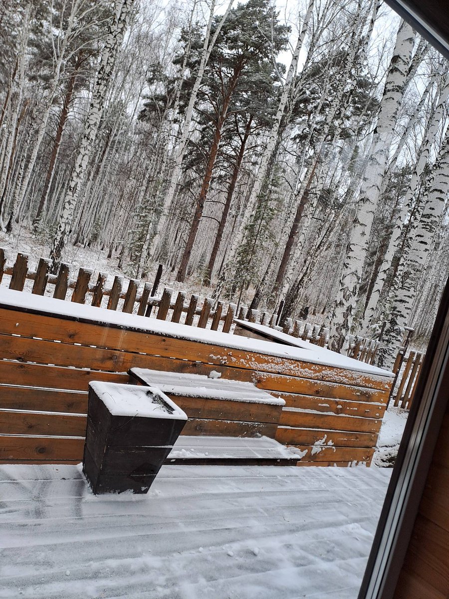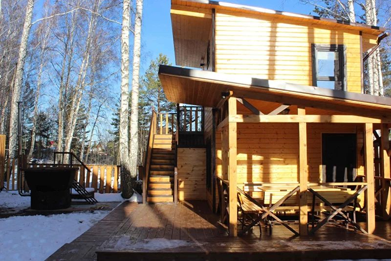 Деревянная двухэтажная баня в стиле хай-тек. Панорамные окна, великолепная терраса, большая огороженная территория среди сосен и берез на которой расположен банный чан и в теплое время бассейн, с территории бани собственный выход в лес к прогулочному терренкуру.