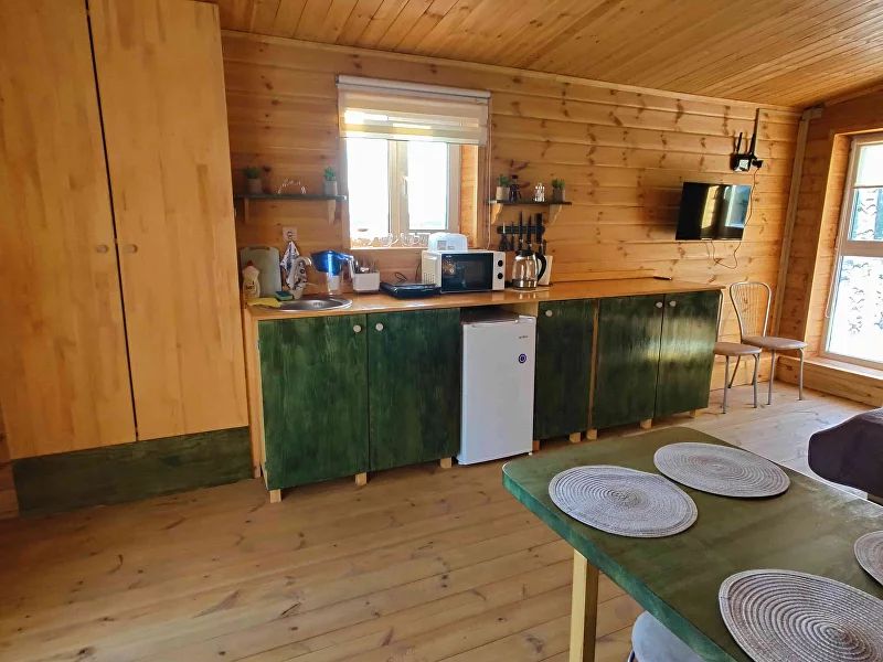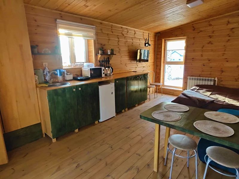 В каждом домике есть все необходимое для приготовления пищи, столовые приборы, микроволновая печь, индукционная плита, холодильник. Так же на территории каждого домика присутствует полностью укомплектованая зона барбекю.
