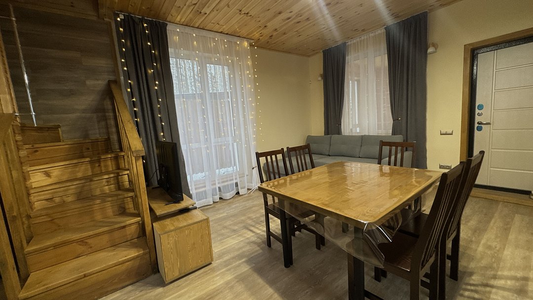 Уютный двухэтажный деревянный дом в современном стиле хай-тек, расположенный на огороженной территории среди сосен и берёз. Панорамные окна, терраса для отдыха, собственный выход в лес к прогулочному терренкуру.