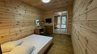 жилая комната с двуспальной кроватью, кухонная зона, диван, санузел, мансардные окна с видом на лес.