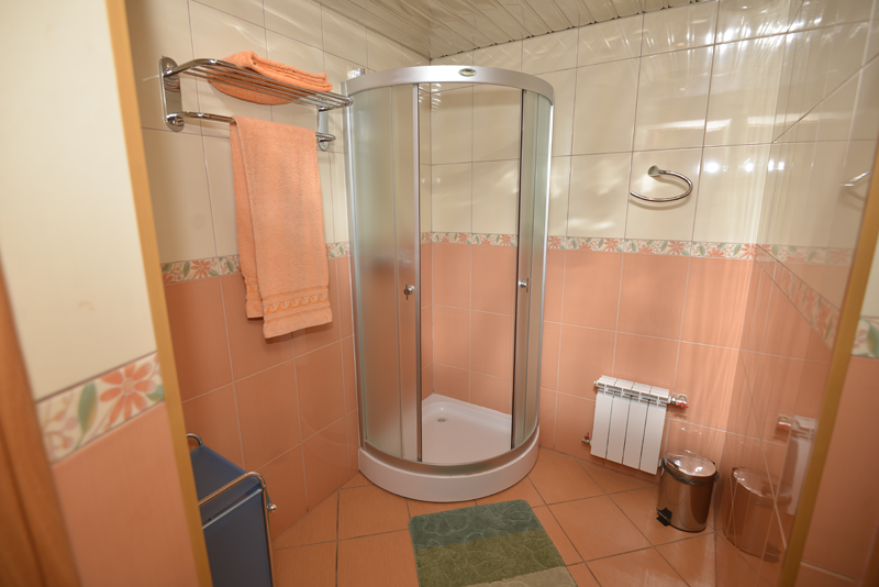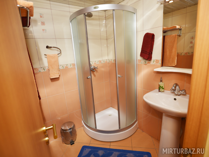 Сан. узел: облицовка стен и пола кафельная плиткой, подвесной потолок. Имеется душевая кабинка, унитаз, умывальный гарнитур с подсветкой, 3х ярусный столик, фен, хромированные туалетные принадлежности.