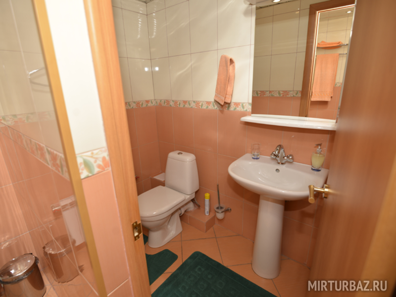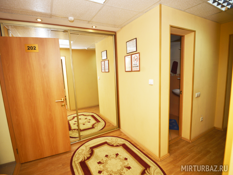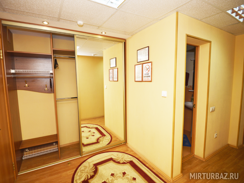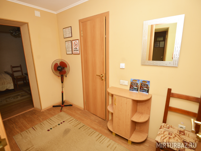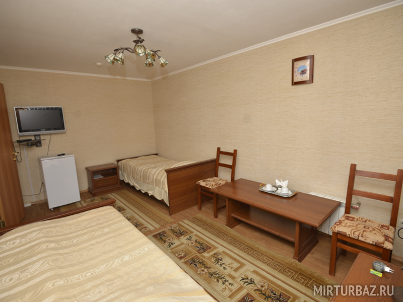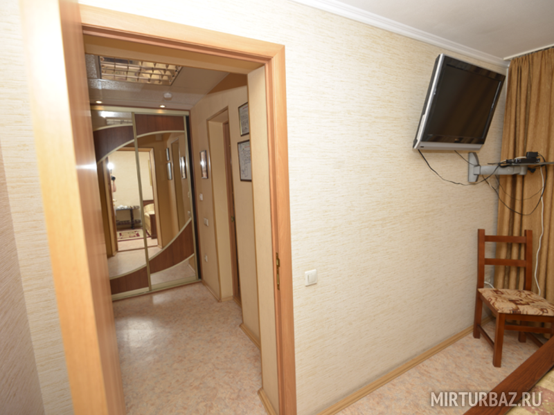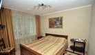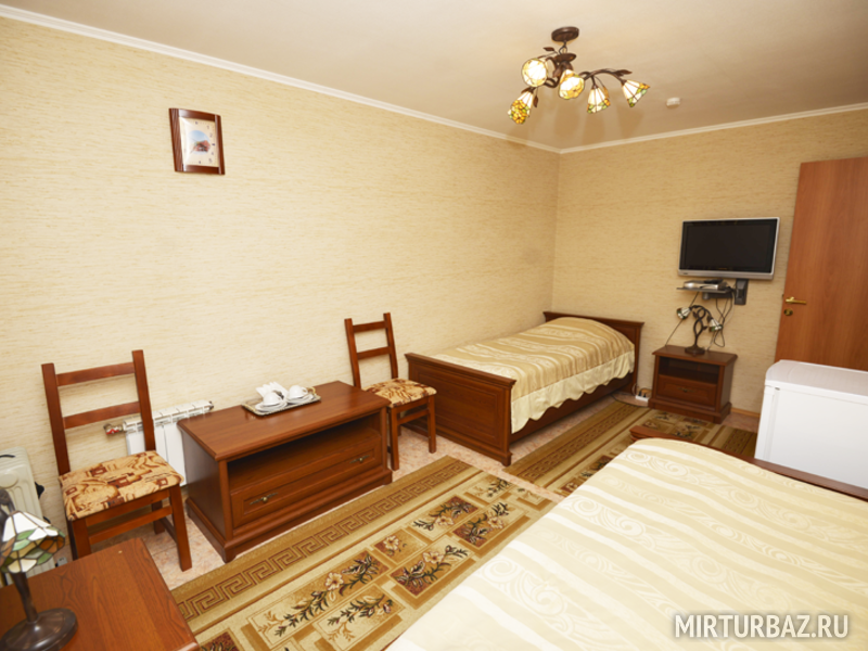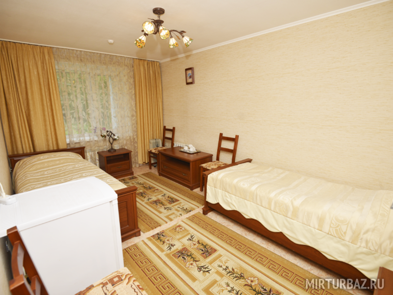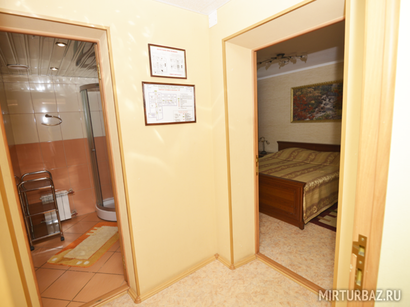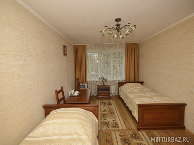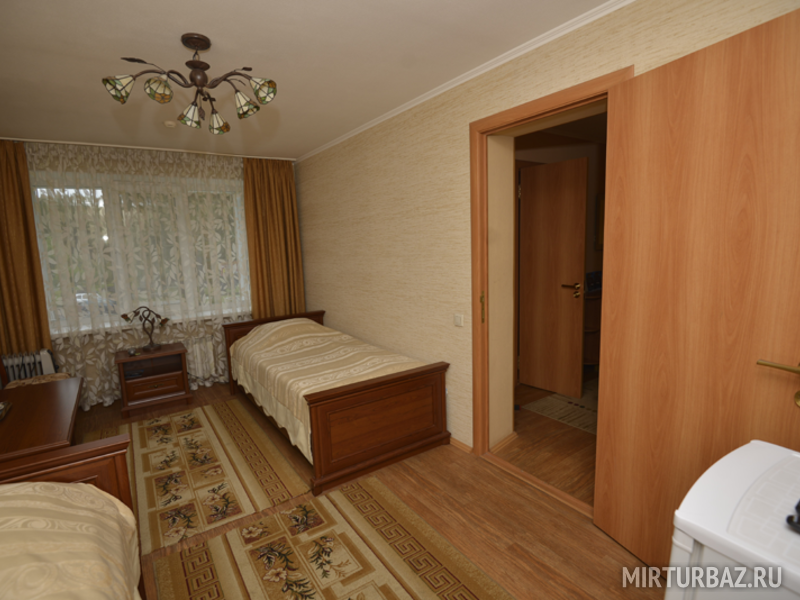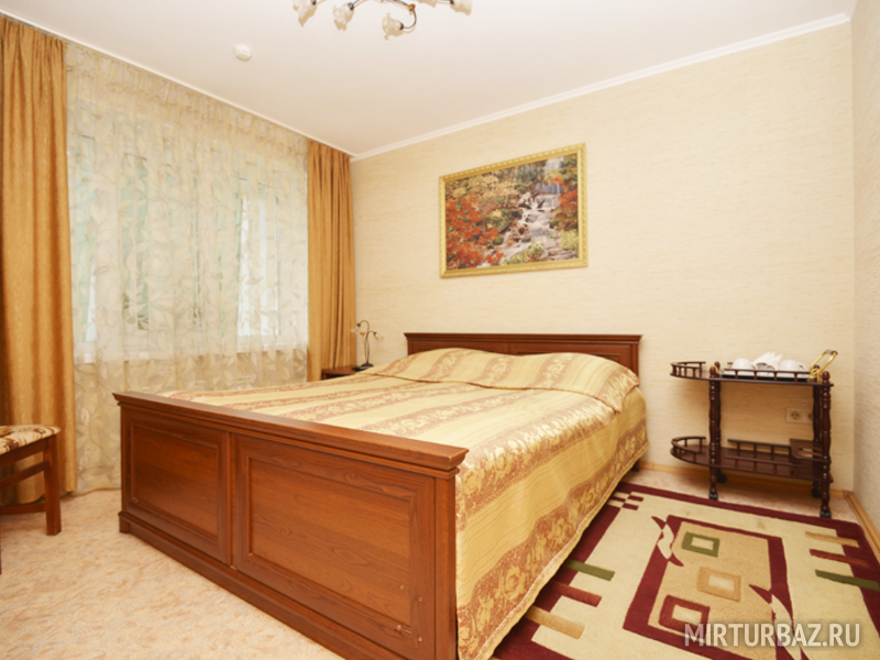 - Спальня: выполнена в бежево-бордовой цветовой гамме. Шторы с затемнением, два вида освещения. Напольное покрытие ламинат-паркет и натуральный ковёр. На стенах гобеленовые картины, мебель из натурального массива дерева. Постельное бельё 100% натуральный хлопок, подушки и одеяла с наполнителем- лебяжий пух. Смена постельного белья производится ежедневно.