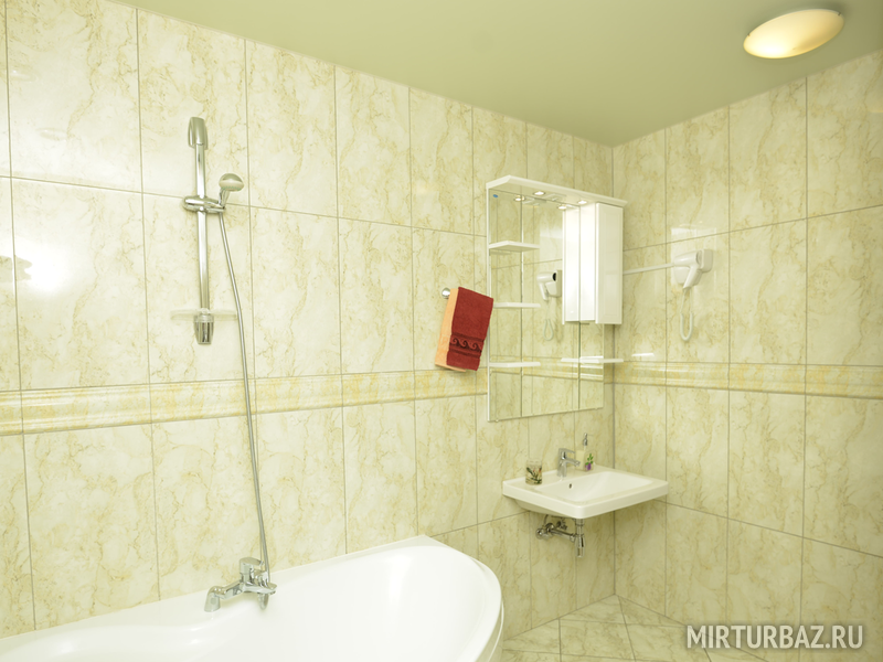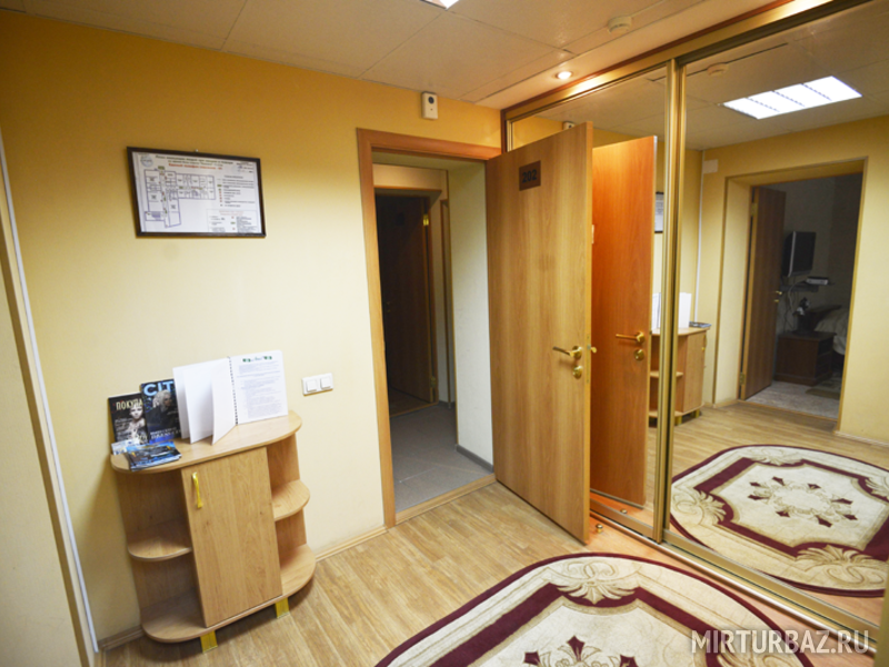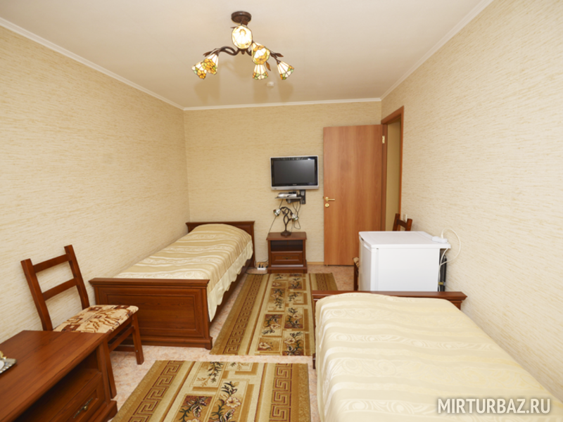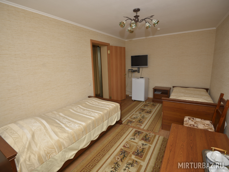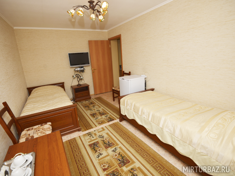 Номера выполнены в бежево-золотистой гамме, напольное покрытие линолеум, натуральные коврики, корпусная мебель.