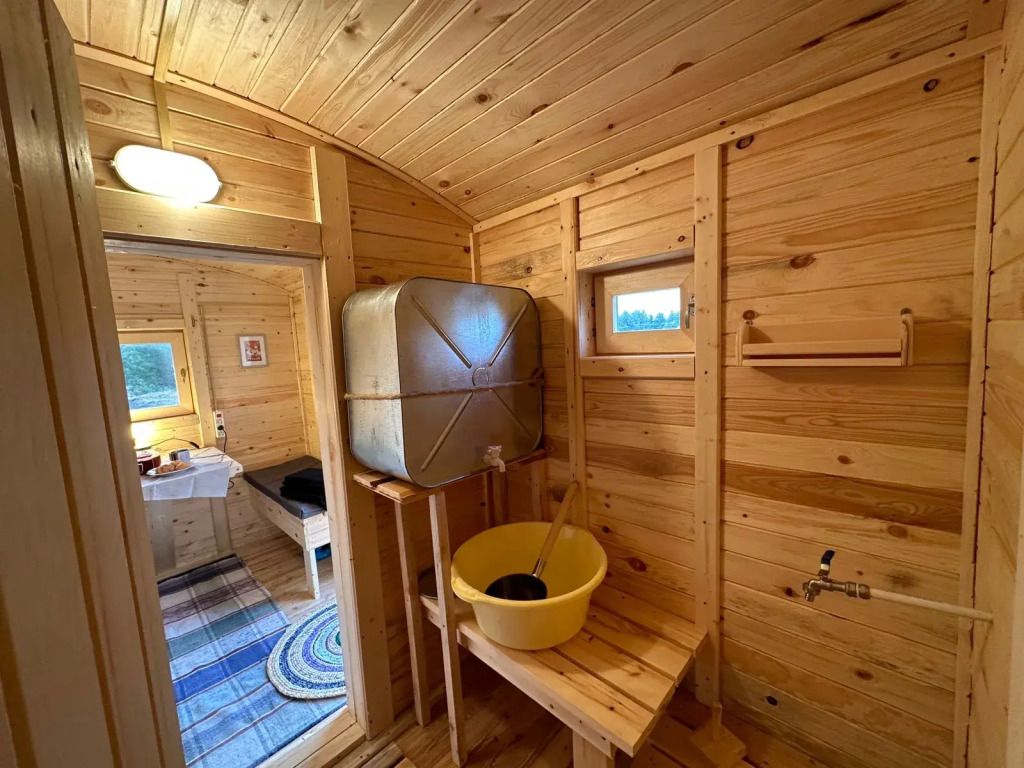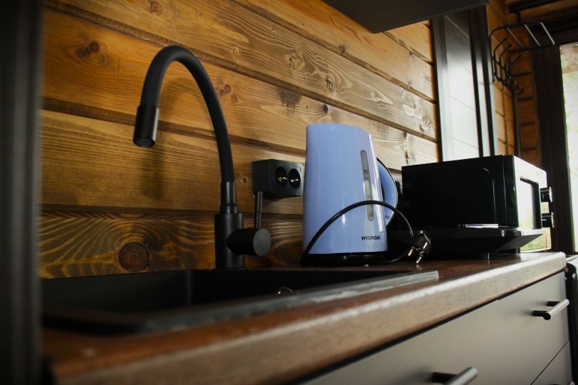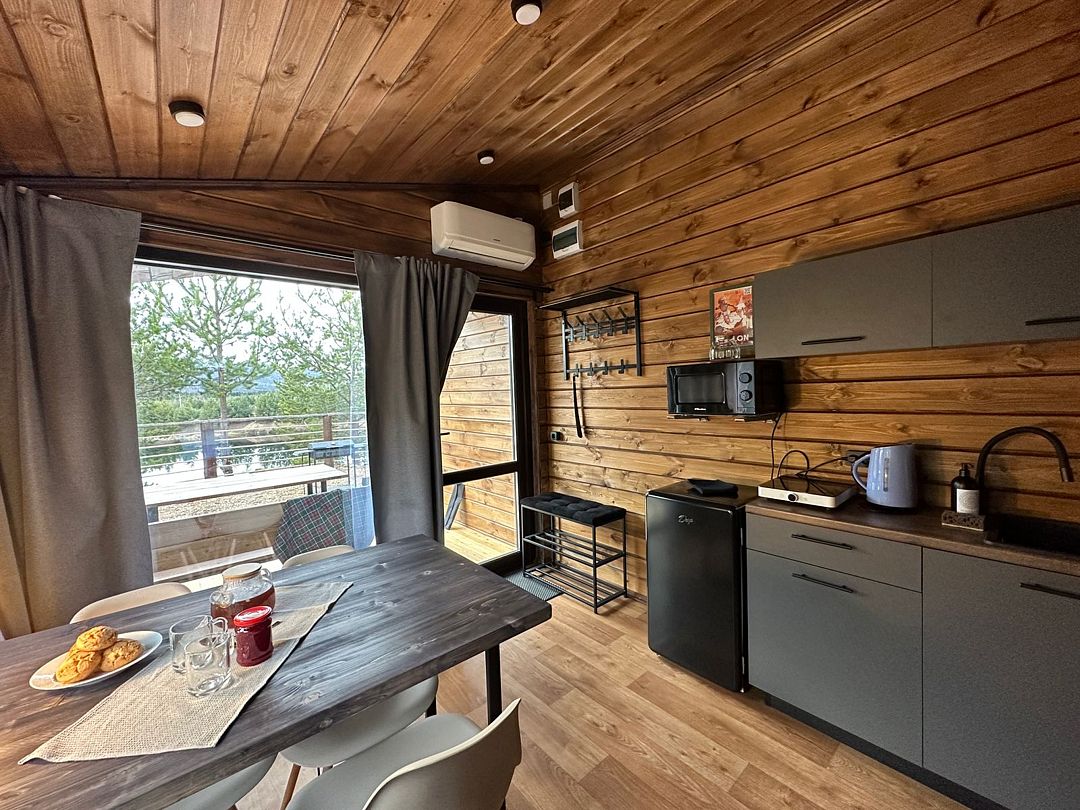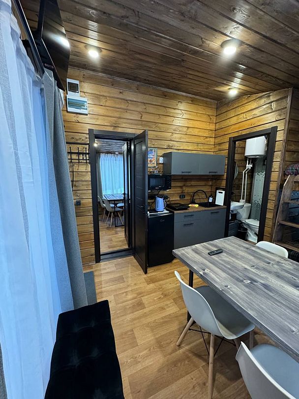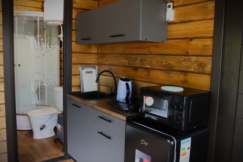Домик площадью 15 квадратных метров с террасой. В домике есть все необходимое для комфортного пребывания: кухня с микроволновой печью, варочной поверхностью, холодильником, чайником, раковиной и всей необходимой посудой для приготовления.