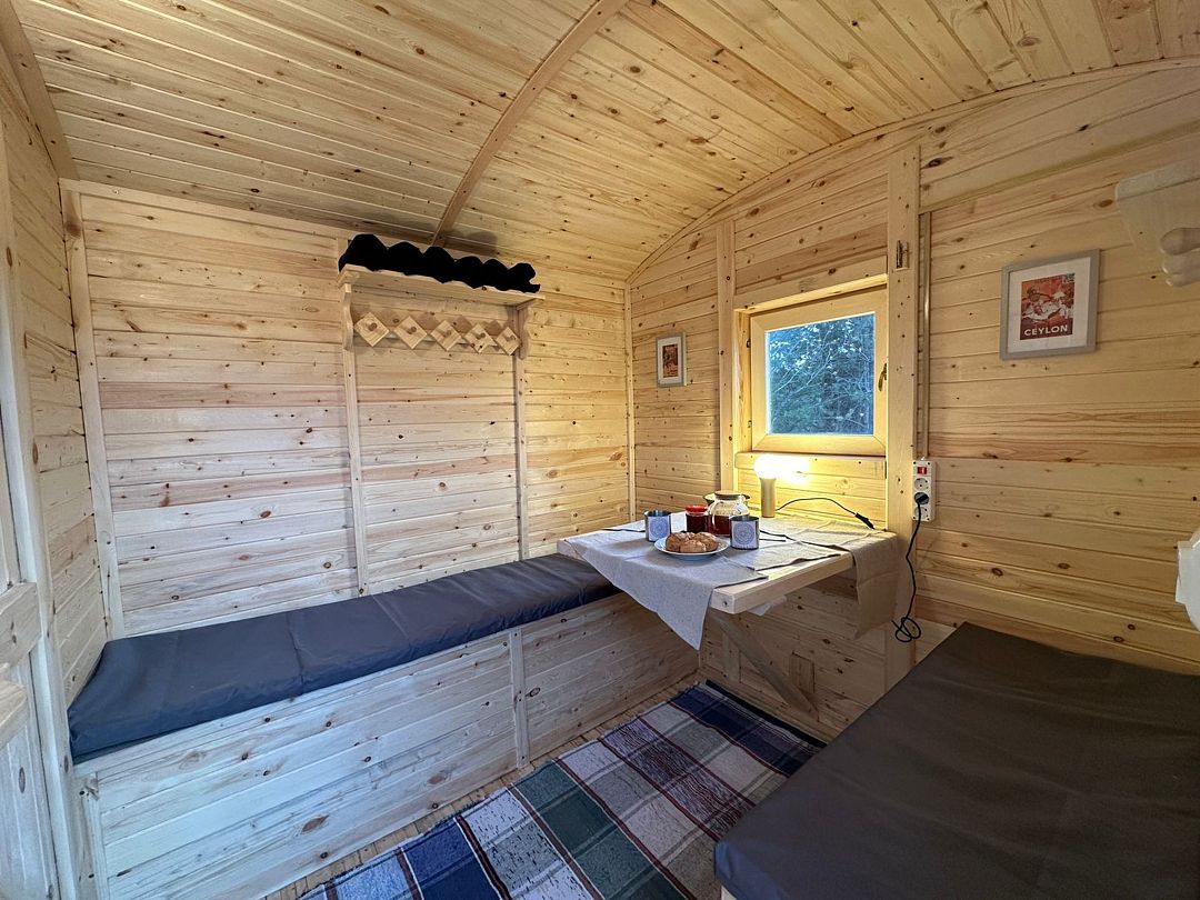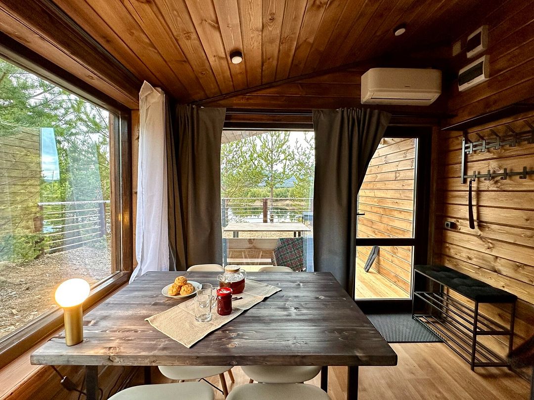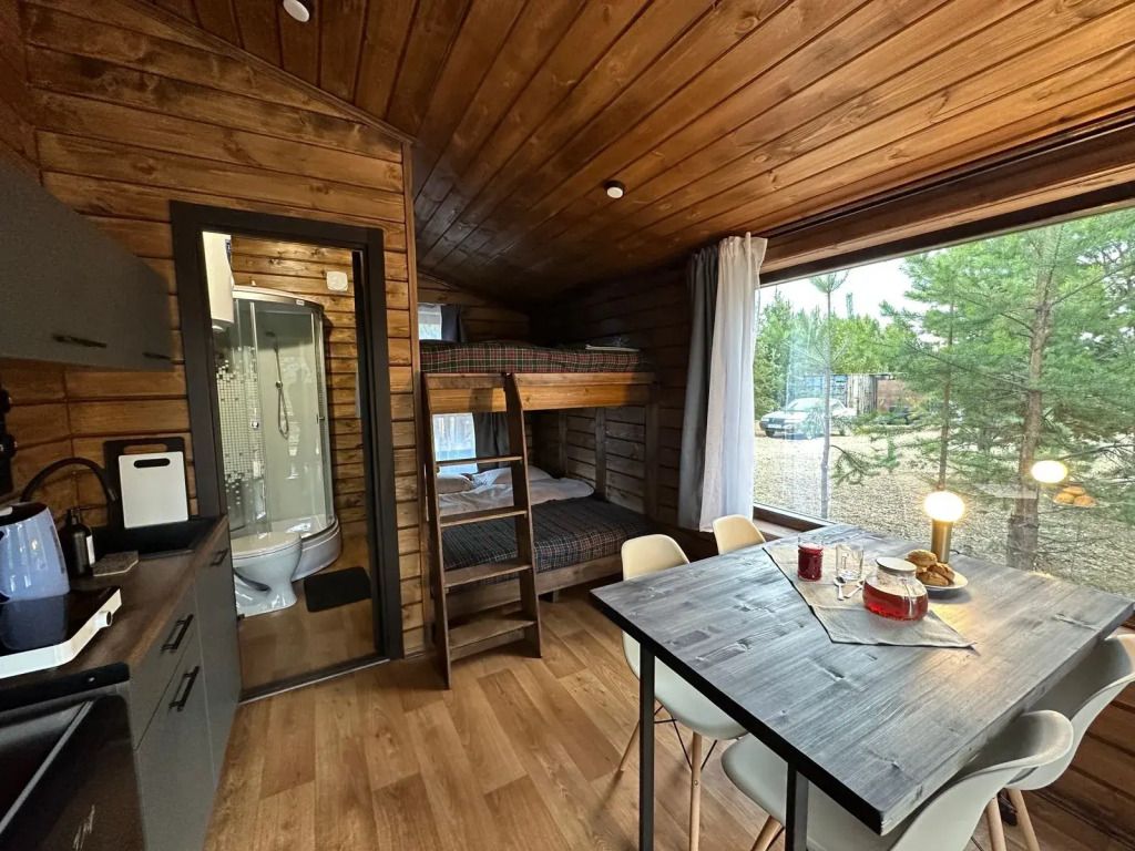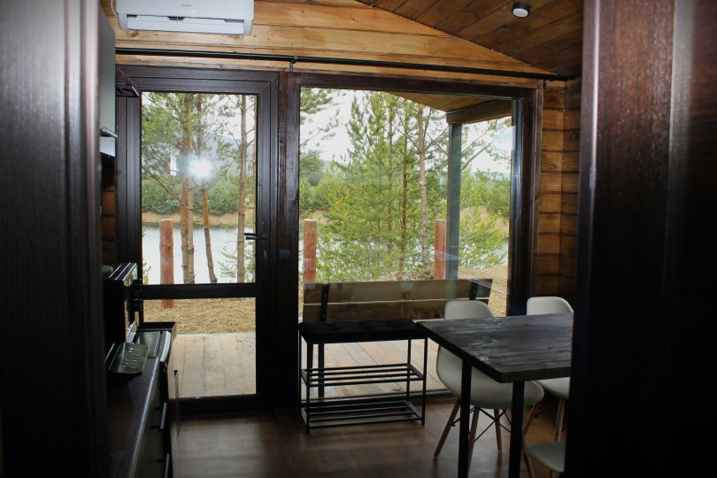 Обеденная зона располагает большим столом и стульями. Спальная зона представлена двуспальной кроватью на первом уровне и еще одной двуспальной кроватью на втором уровне. Каждый домик оборудован санузлом с душевой кабиной.