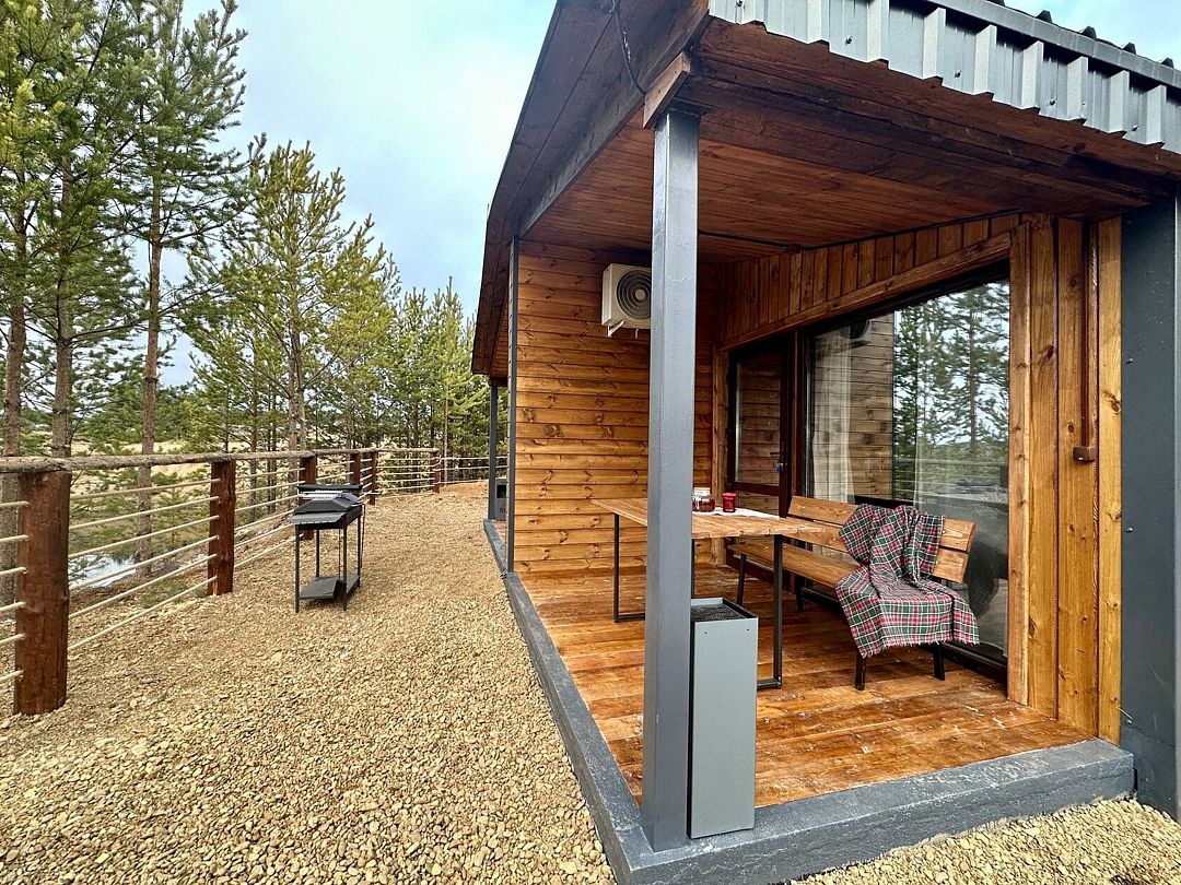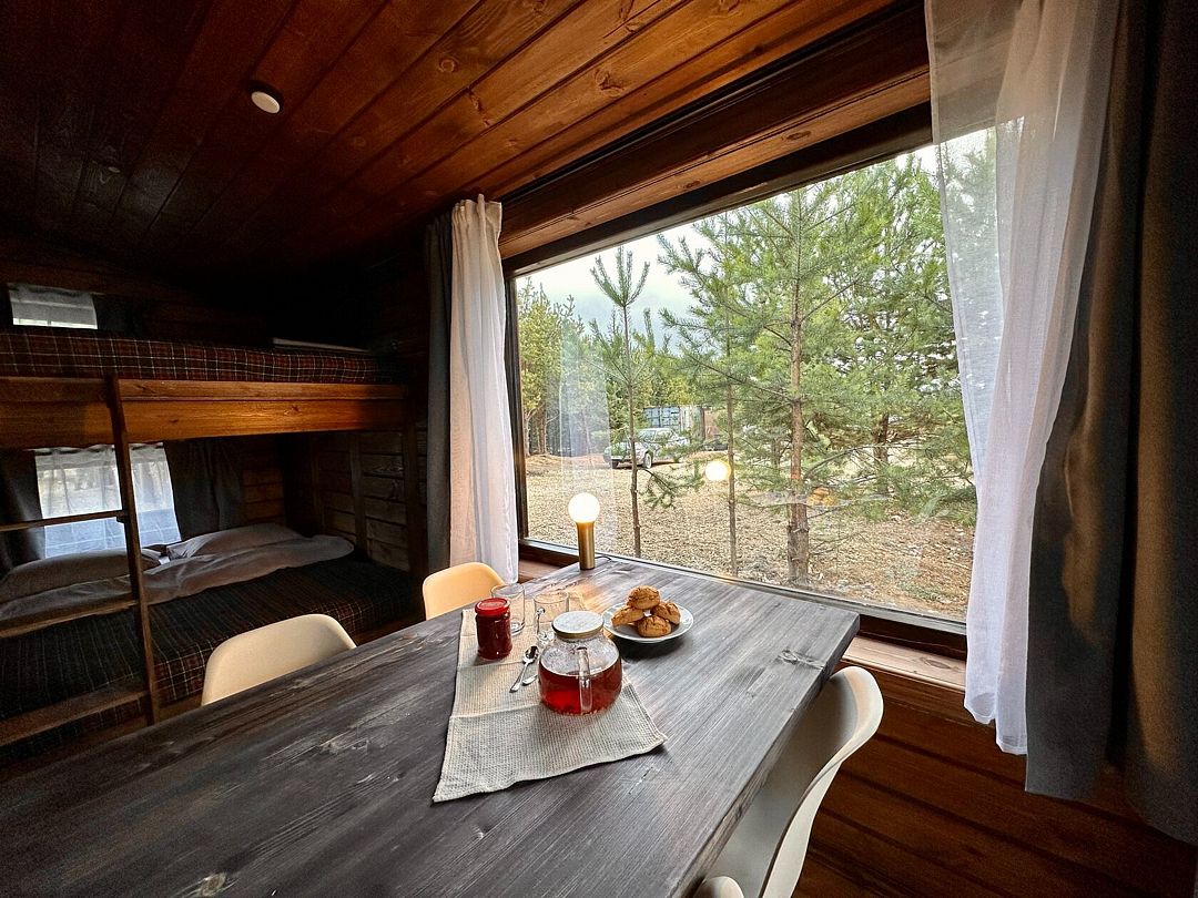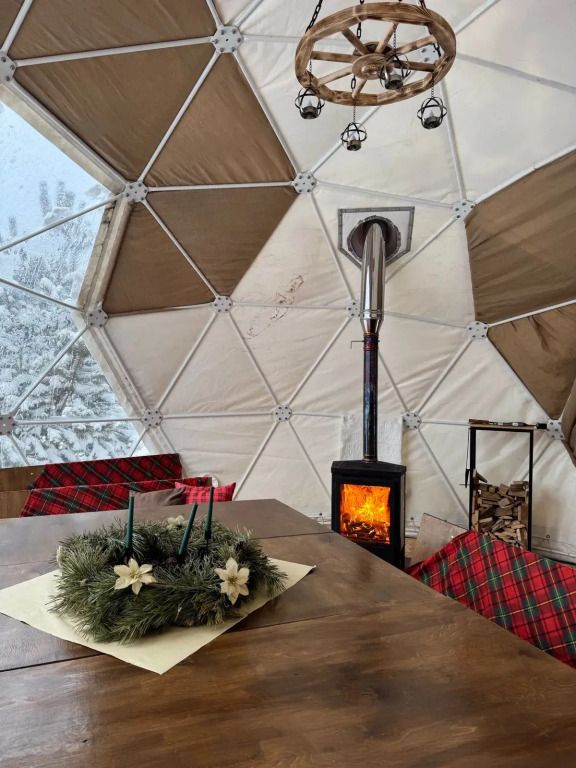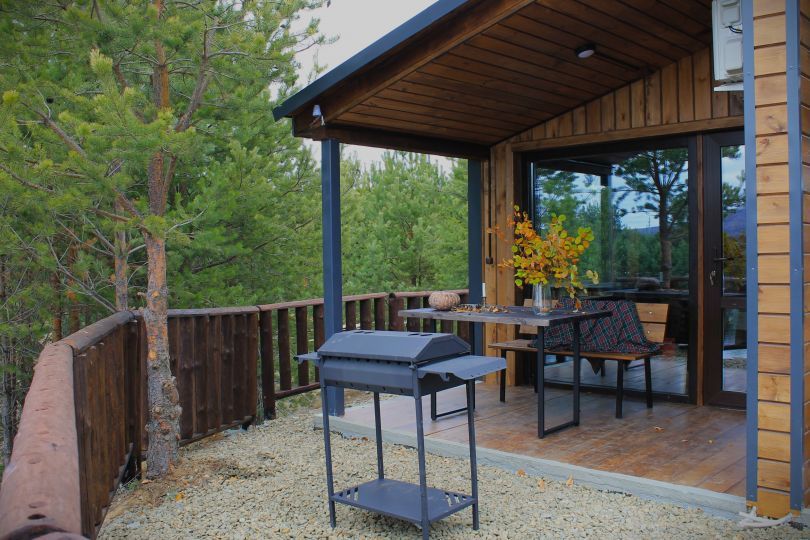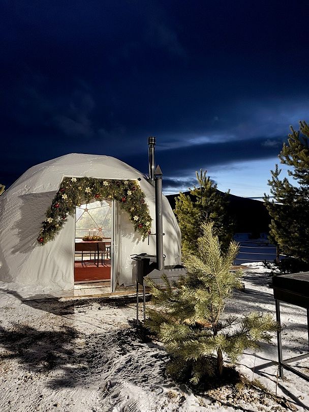 Проживание организовано в уютных домиках с панорамными окнами, из которых открываются завораживающие пейзажи. Для больших компаний создана необычная беседка-купол с камином и просторным столом — идеальное место для застолий и праздников в любое время года. Мангал позволит приготовить ароматные блюда на открытом огне, добавляя особый колорит отдыху.