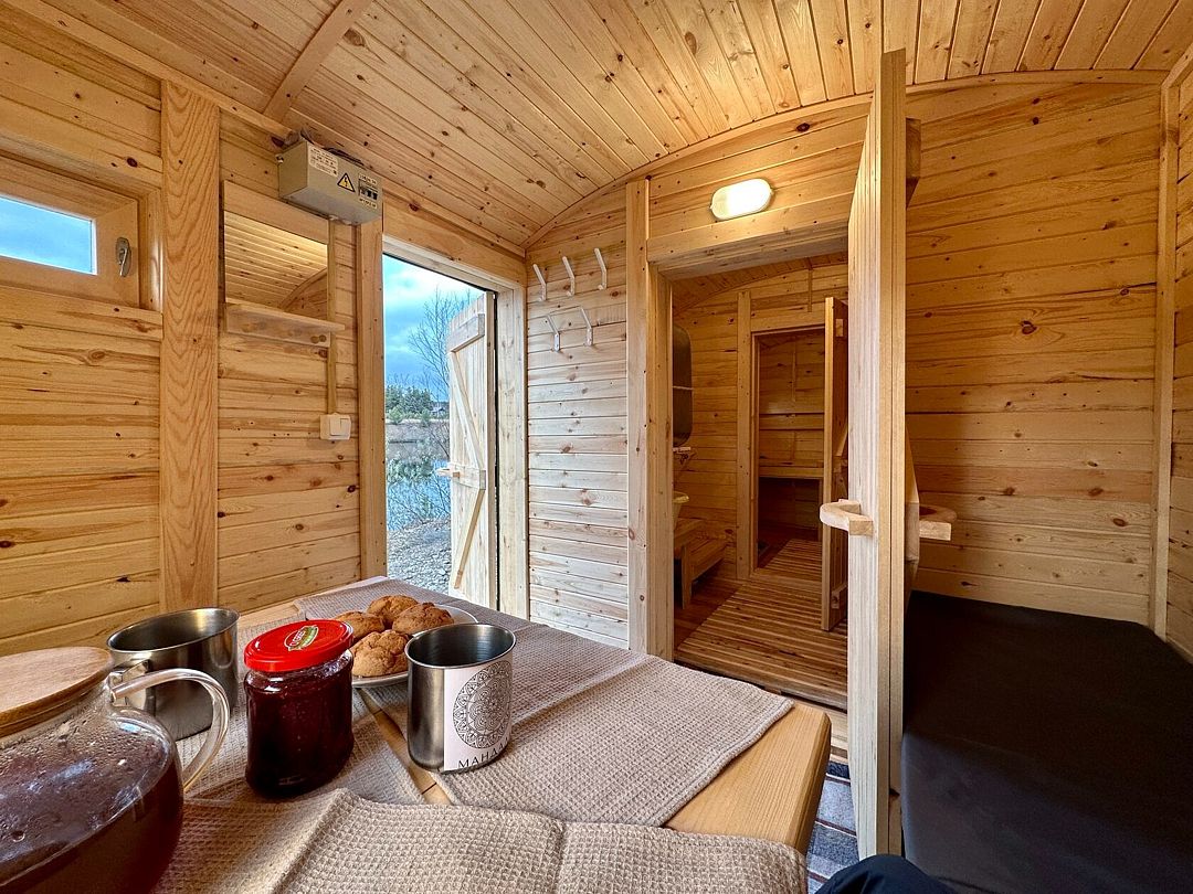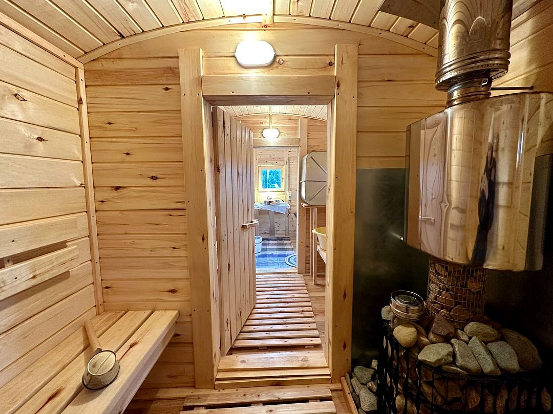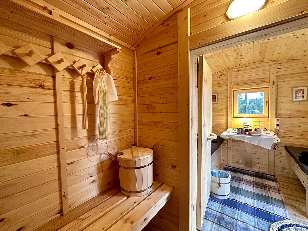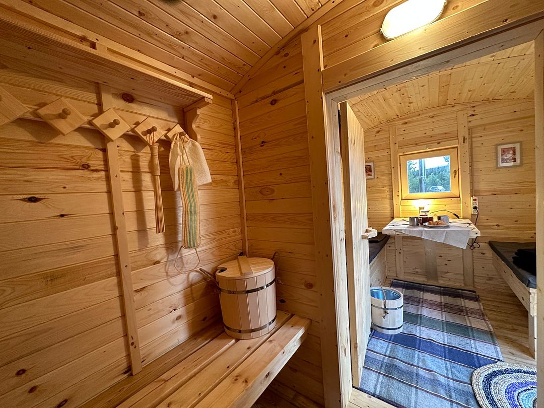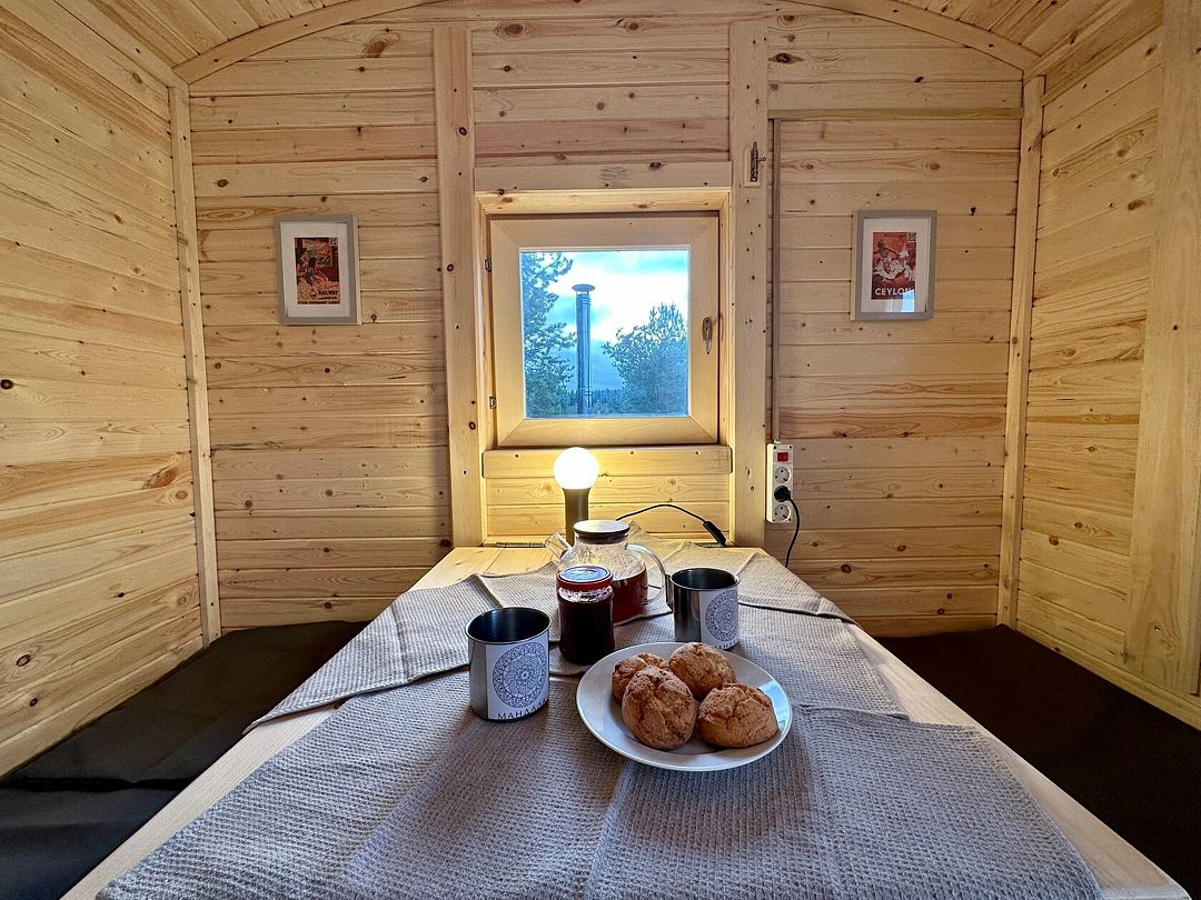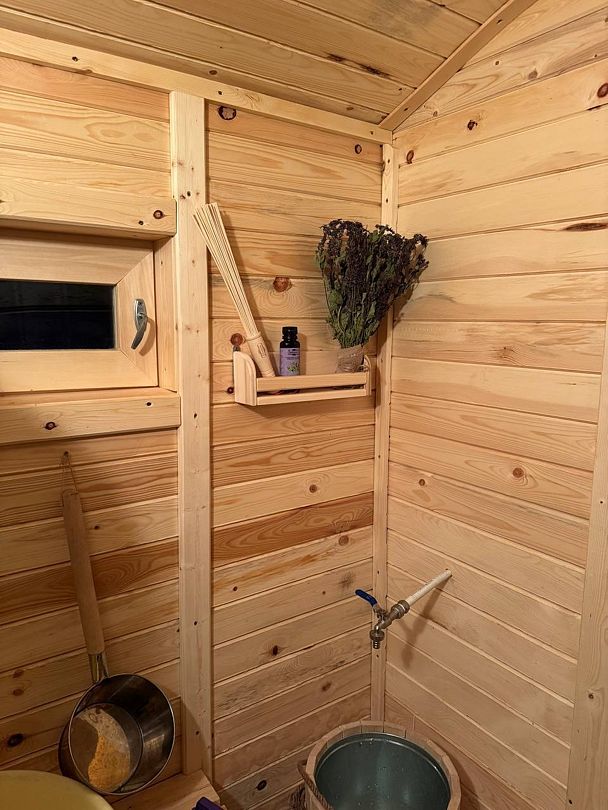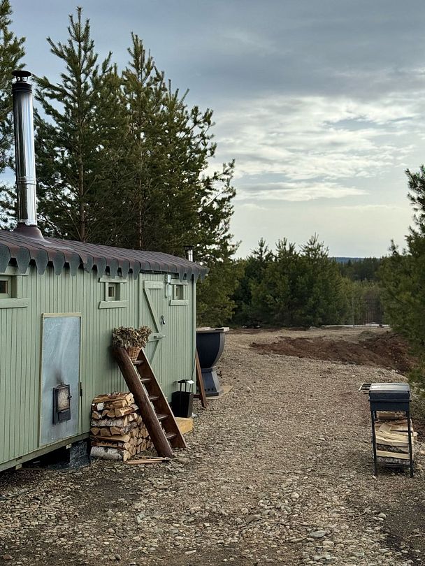 Особой изюминкой глэмпинга стала традиционная русская баня, способная принять до восьми человек. После парной гости окунаются в горячий чан под открытым небом, наслаждаясь видом на горы и расслабляясь после насыщенного дня. В комнате отдыха их ждут мед и травяной чай — маленькие радости, которые делают пребывание здесь по-настоящему запоминающимся.