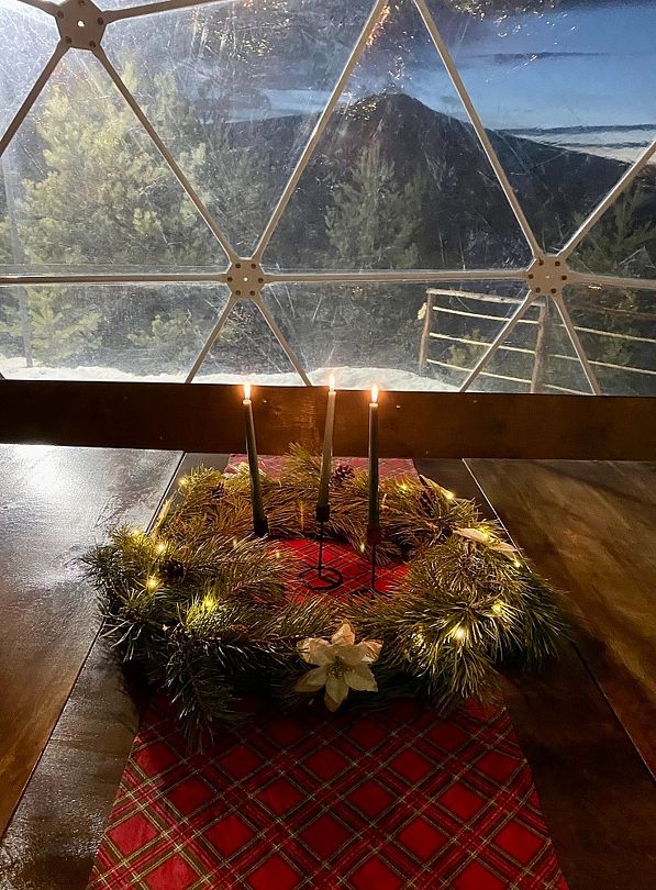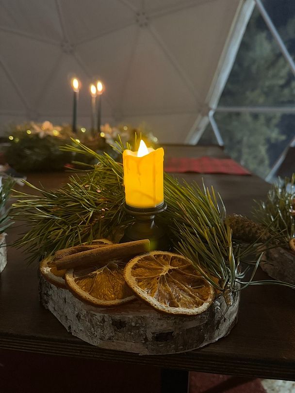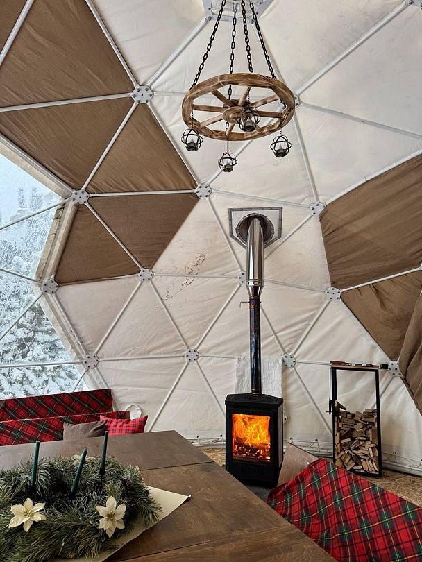 Гостей ждет уникальная беседка в форме купола, вмещающая до двадцати человек. Внутри расположены камин и большой стол, что создаёт атмосферу уюта, а панорамные окна позволяют наслаждаться великолепием природы.