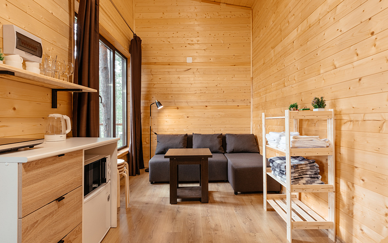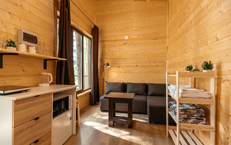 Вас ждут уютные домики, в каждом из которых есть кухонный уголок, удобная мебель и прочими удобствами, необходимыми для комфортного проживания.