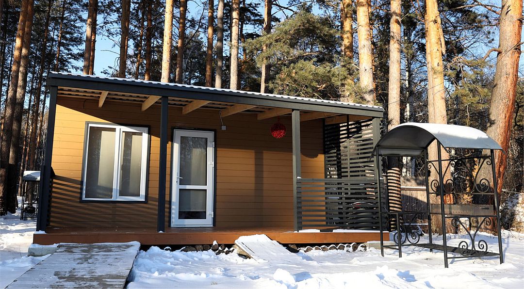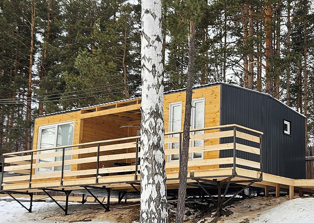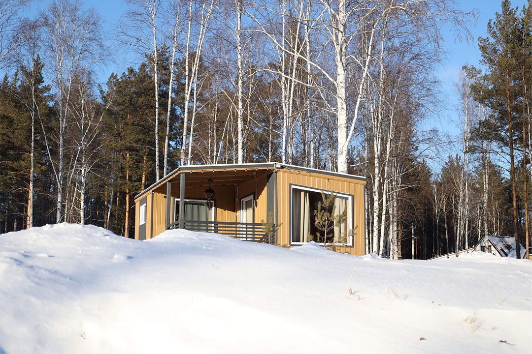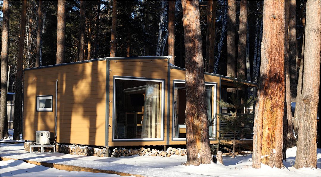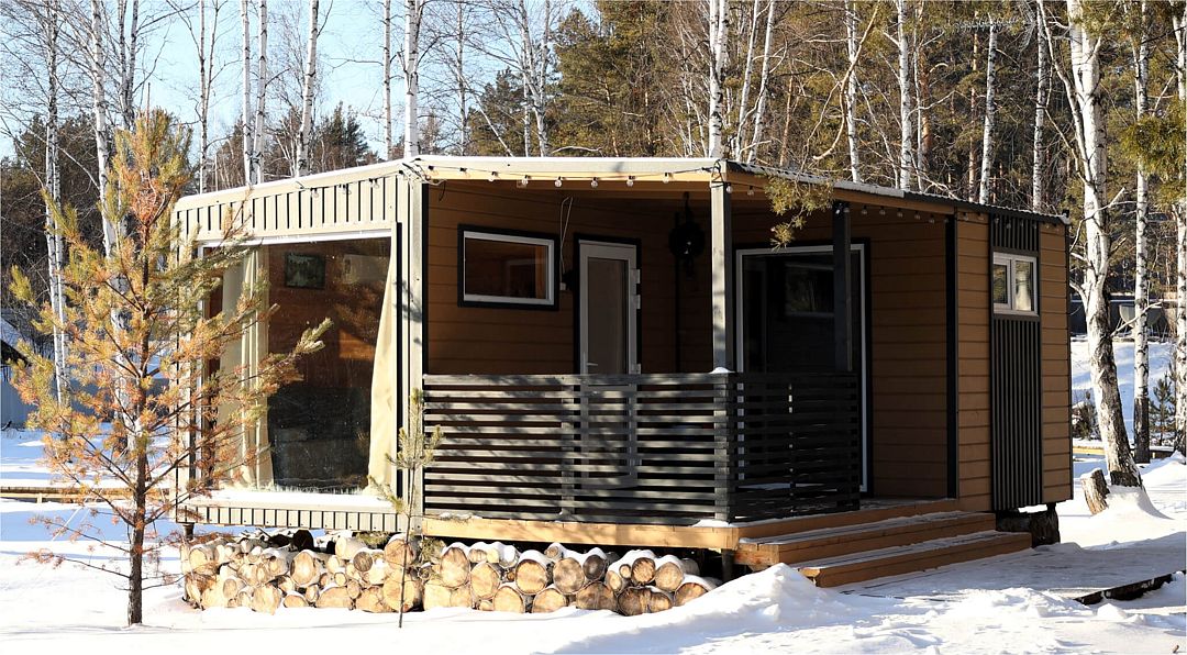Одномодульный Г-образный средний домик в 21 квадратный метр вмещает четырёх человек: семью или дружную компанию.