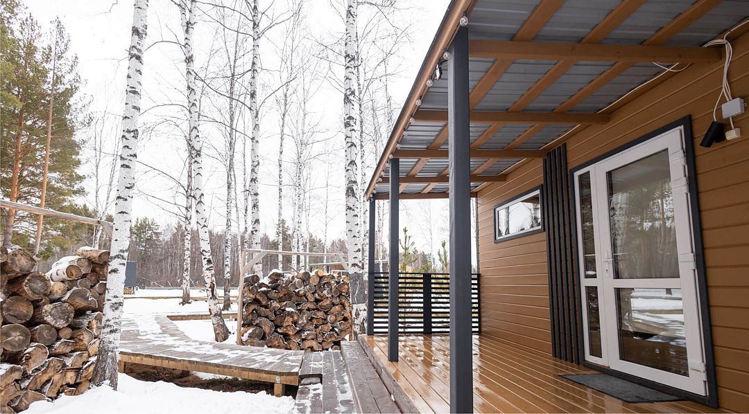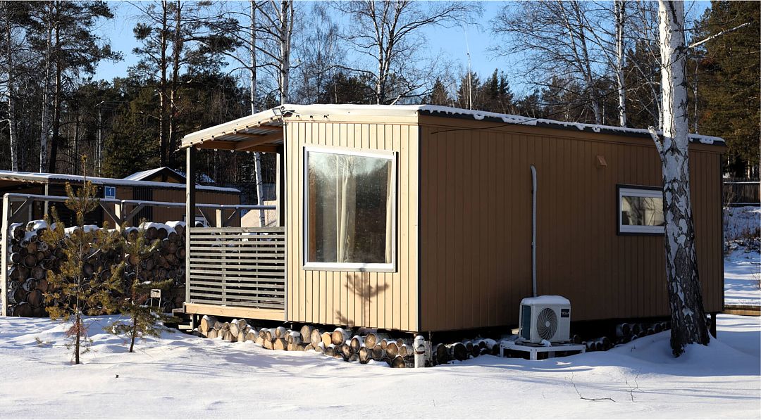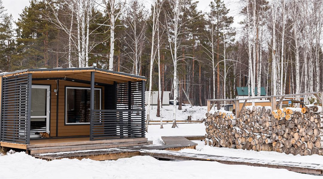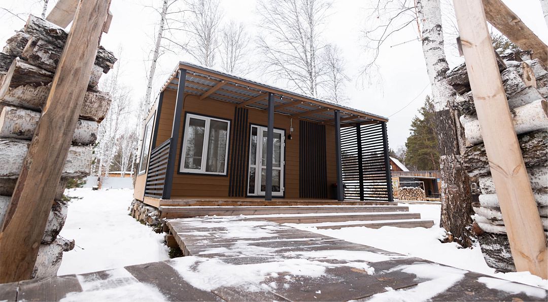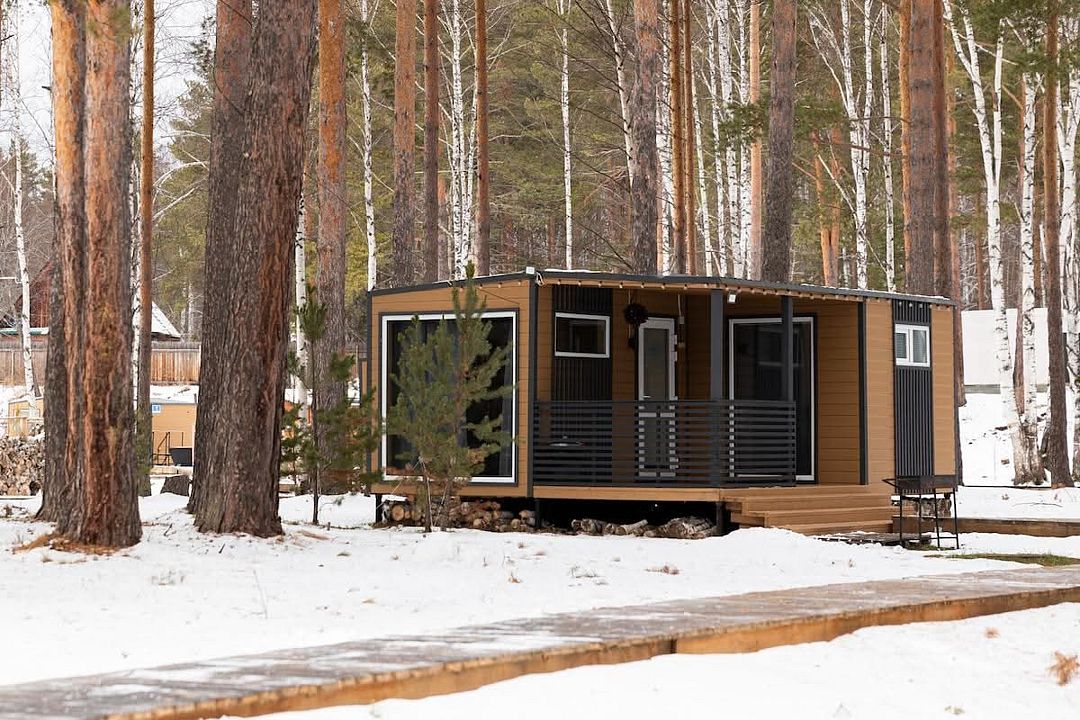 Одномодульный Г-образный средний домик в 21 квадратный метр вмещает четырёх человек: семью или дружную компанию.