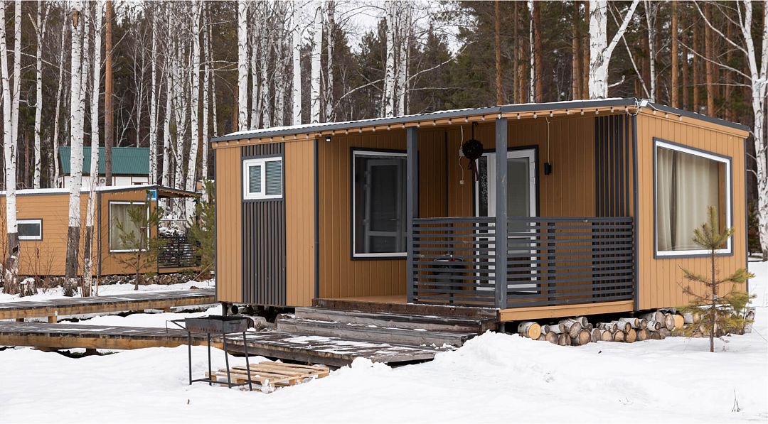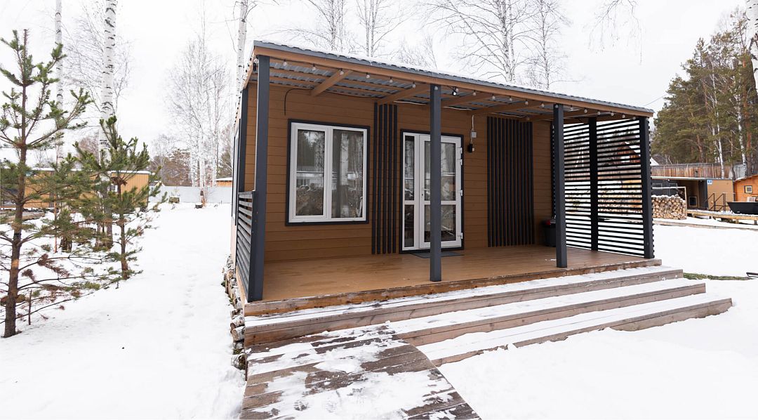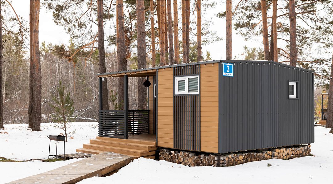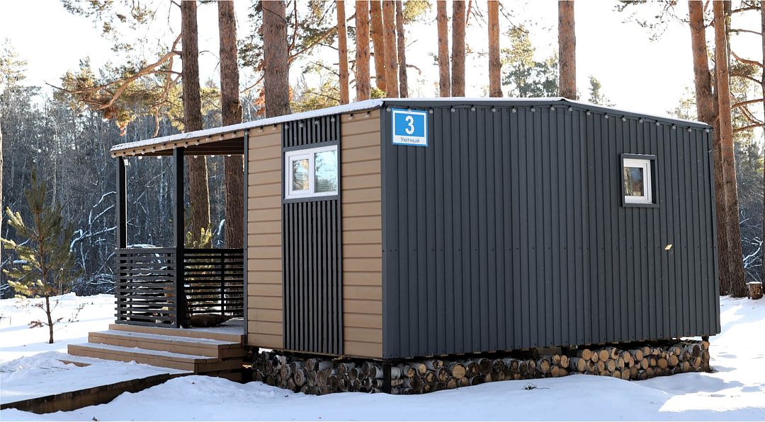 Трехмодульный домик семейный площадью 35 квадратных метров рассчитан на шесть гостей. Он прекрасно подойдёт для семьи из родителей и двух детей или небольшой компании.