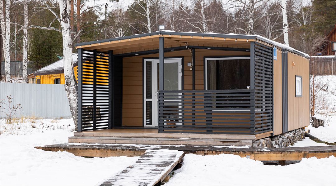 Одномодульный Г-образный средний домик в 21 квадратный метр вмещает четырех человек: семью или дружную компанию.