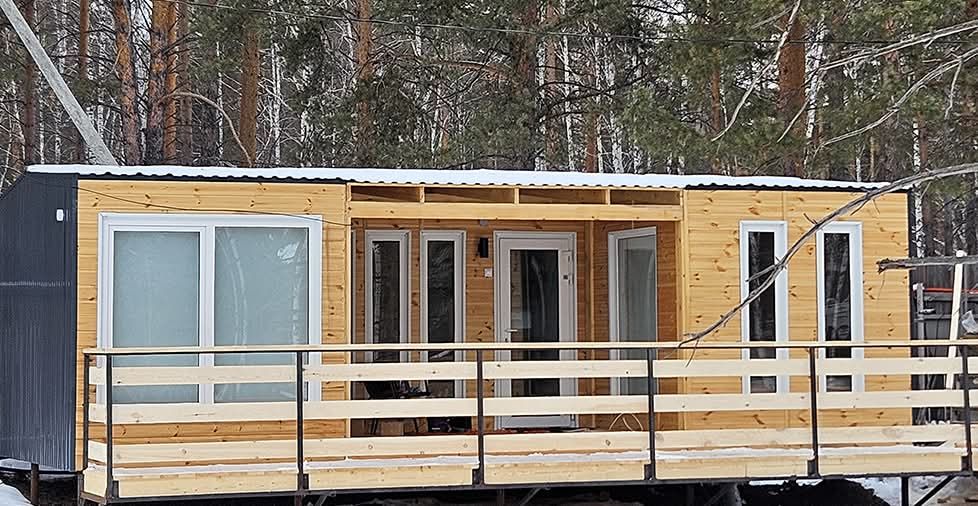 Двухмодульный домик семейный площадью 30 квадратных метров рассчитан на четырёх гостей. Он прекрасно подойдёт для семьи из родителей и двух детей или небольшой компании.