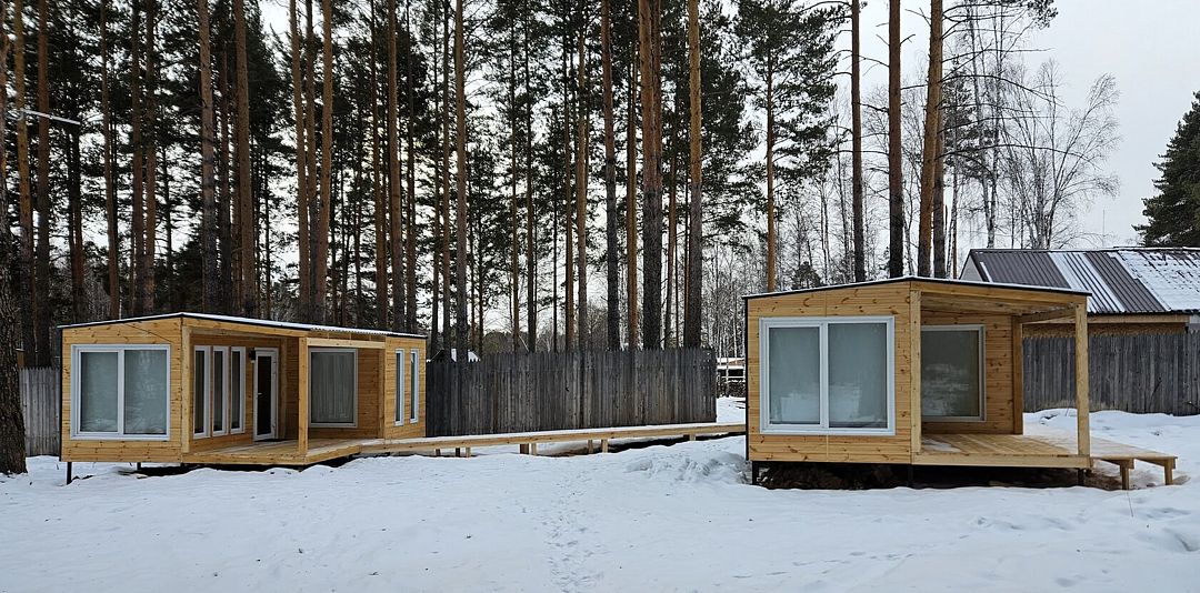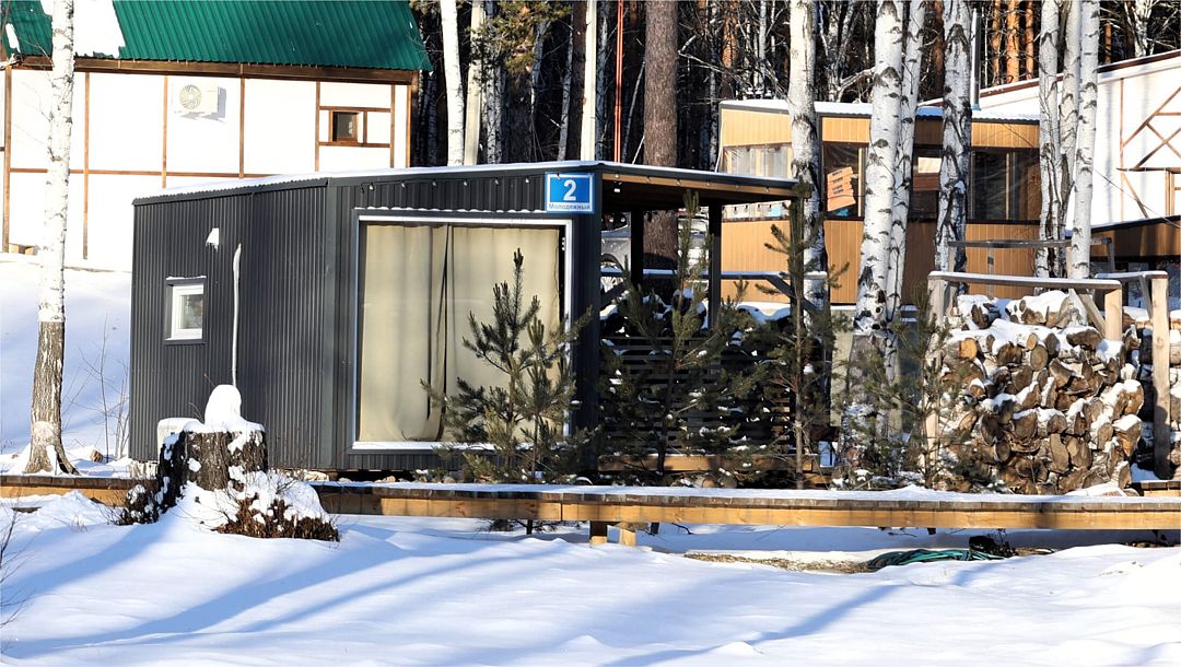 Двухмодульный домик семейный площадью 30 квадратных метров рассчитан на четырех гостей. Он прекрасно подойдёт для семьи из родителей и двух детей или небольшой компании.
