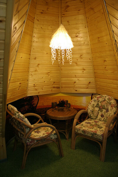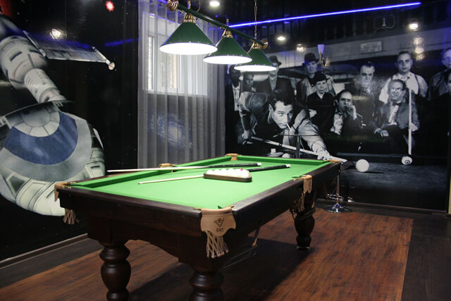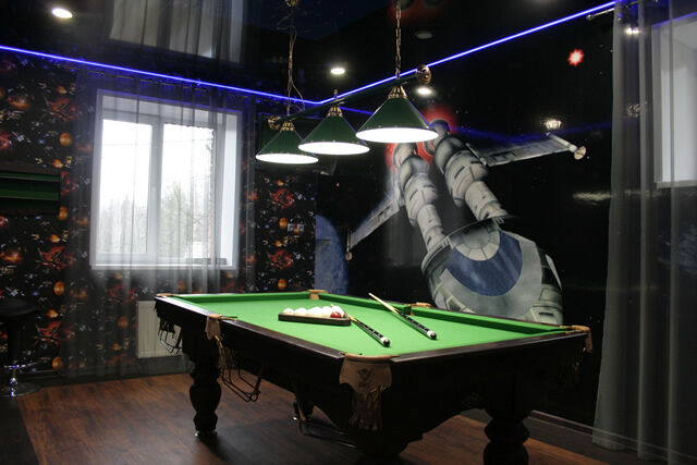 Банкетный зал вместимостью до 20 человек, с настоящим камином, плазменным TV, стереосистемой, DVD, караоке. Бильярдная комната с мебелью, спутниковым TV, DVD, караоке, танцплощадкой с шестом, массажным креслом