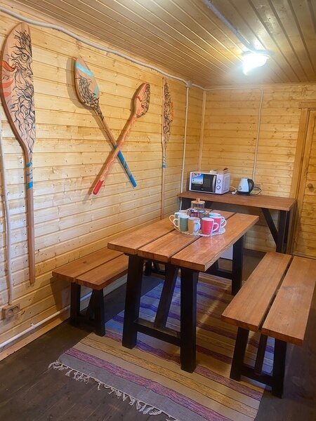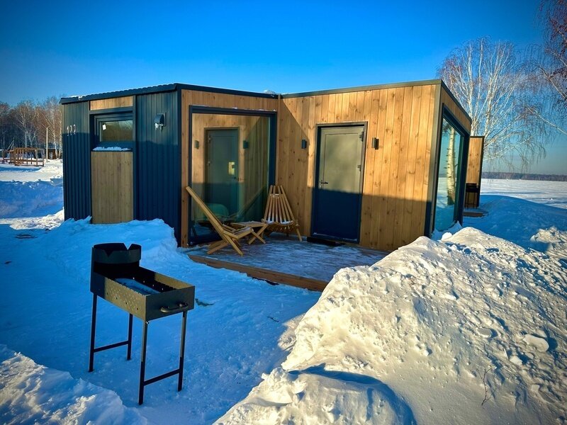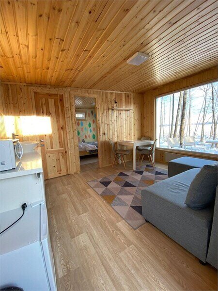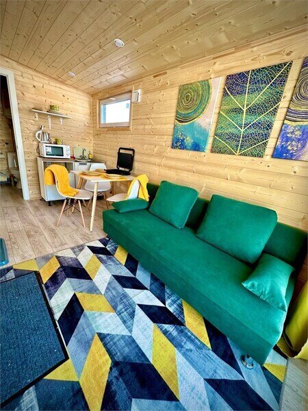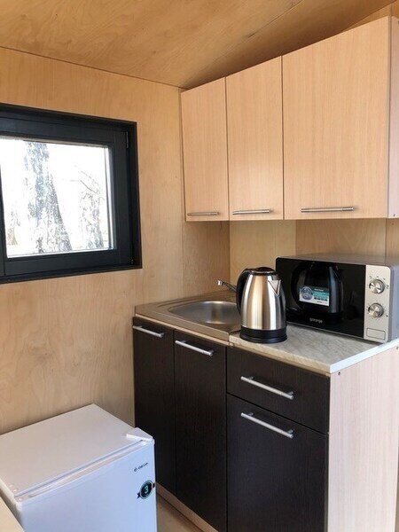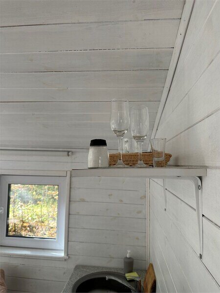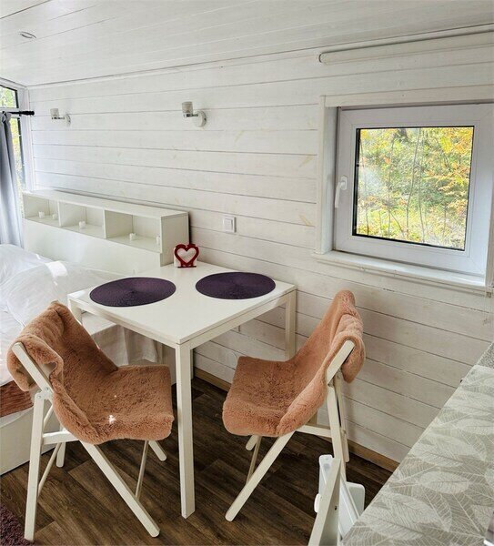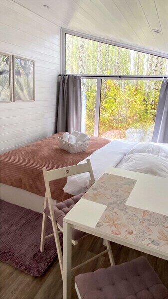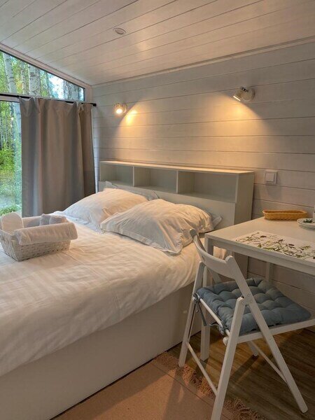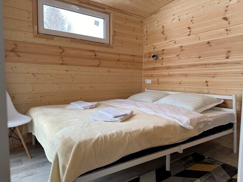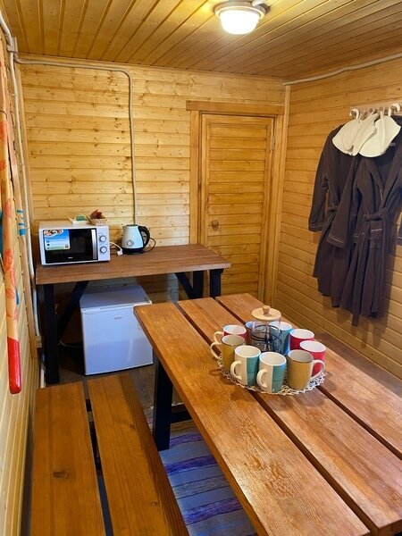 Домик рассчитан до 4 гостей, 2 комнаты, из которых одна гостиная с мини кухней (микроволновка, посуда, чайник, кружки) и одна комната с двуспальной кроватью. Ванная комната с душевой кабиной и унитазом, набор полотенец, 2 халата. У домика на улице мангал и стол, 2 стула.