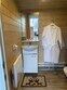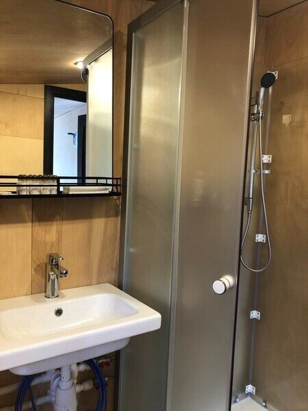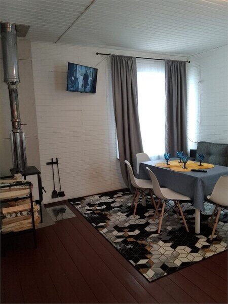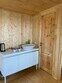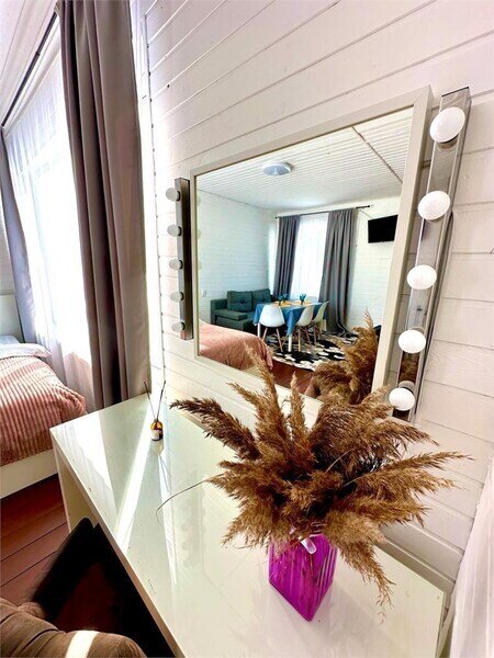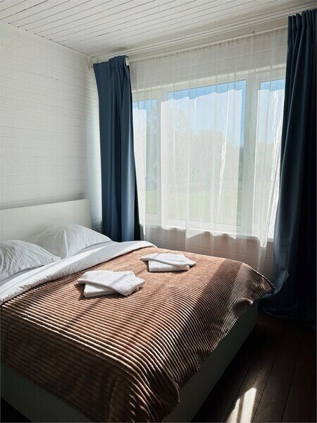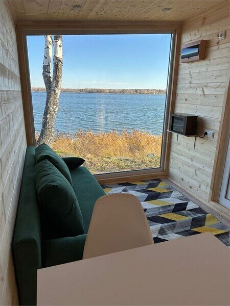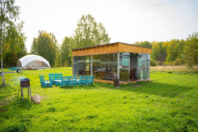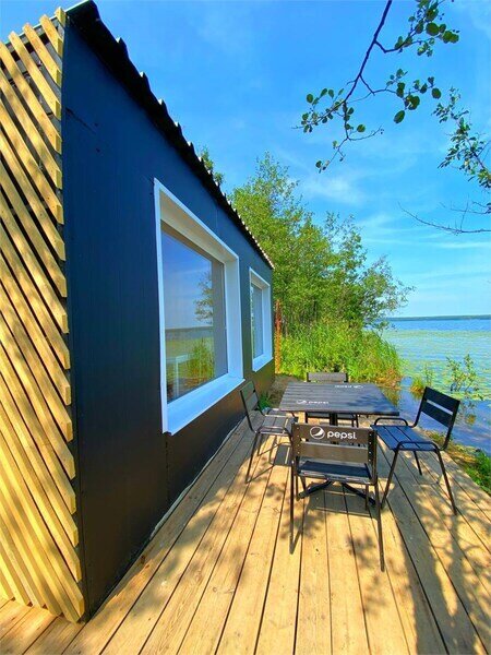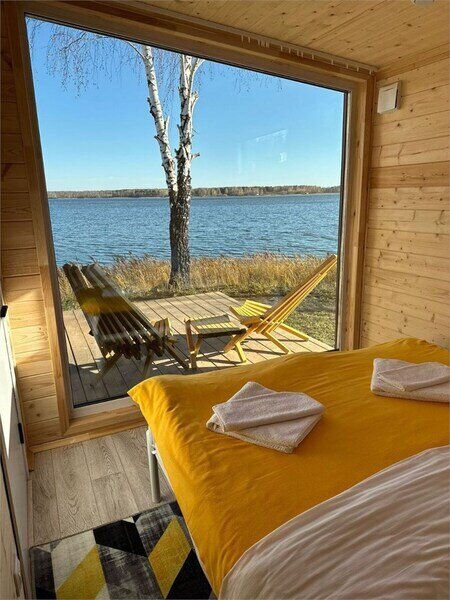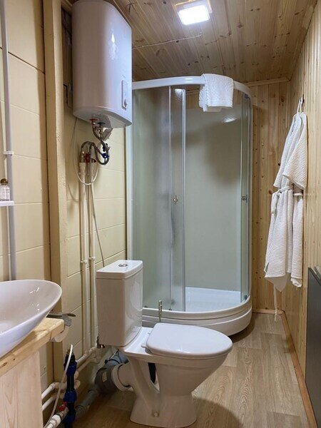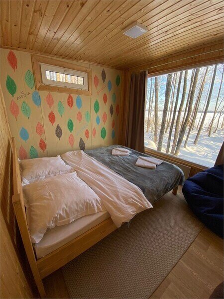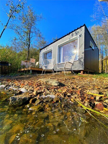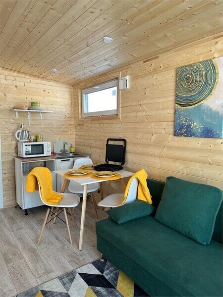 Домик рассчитан до 4 гостей, 2 комнаты, из которых одна гостиная с мини кухней (микроволновка, посуда, чайник, кружки) и одна комната с двуспальной кроватью. Ванная комната с душевой кабиной и унитазом, набор полотенец, 2 халата. У домика на улице мангал и стол, 2 стула.