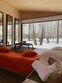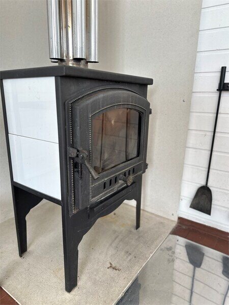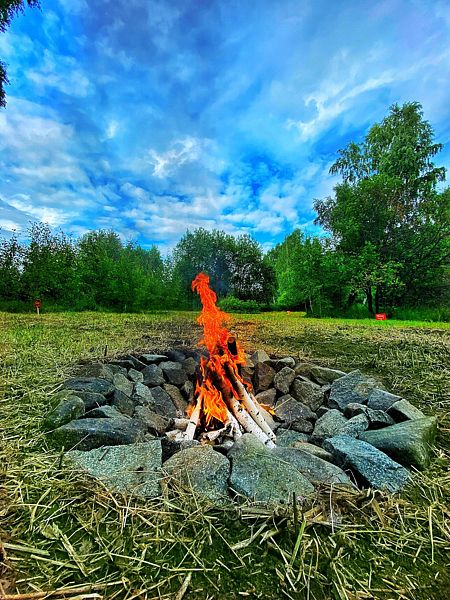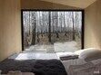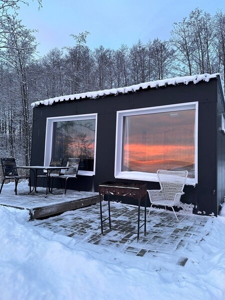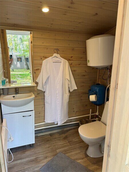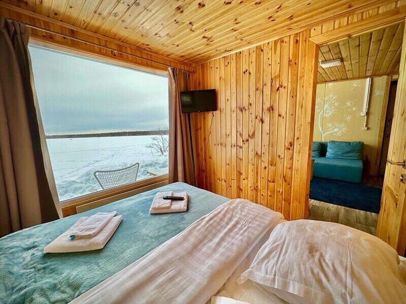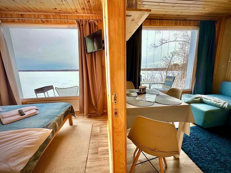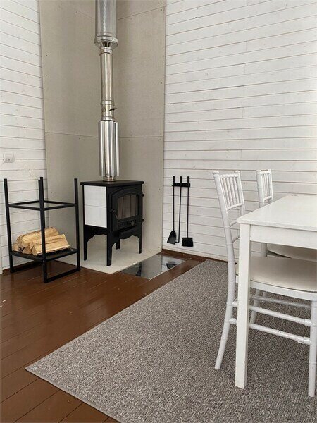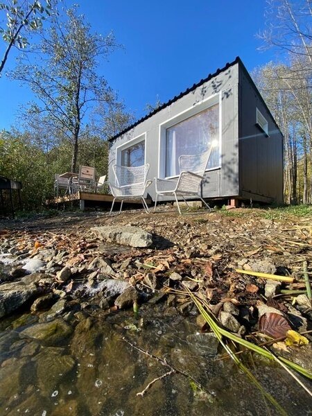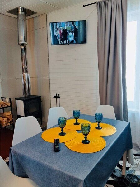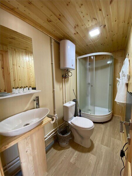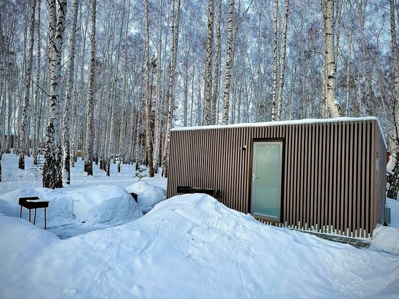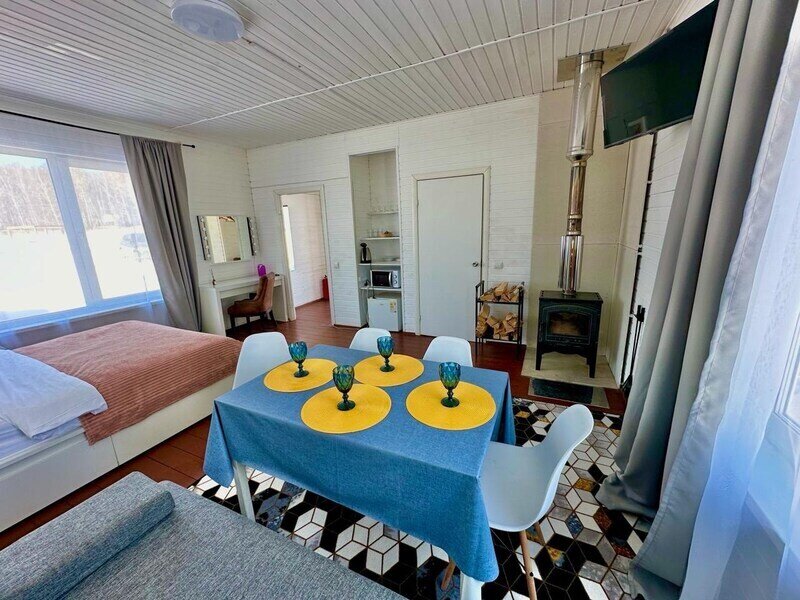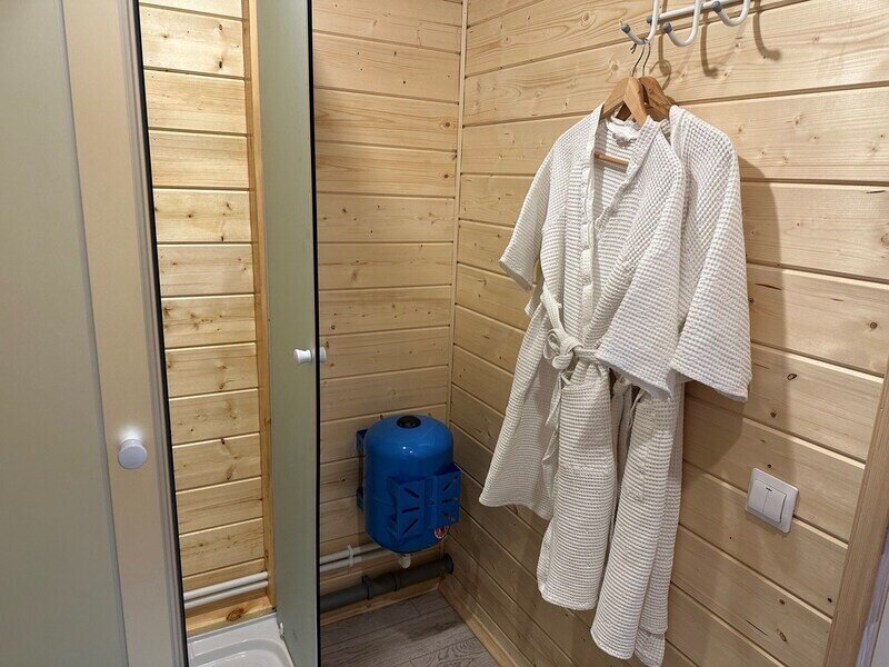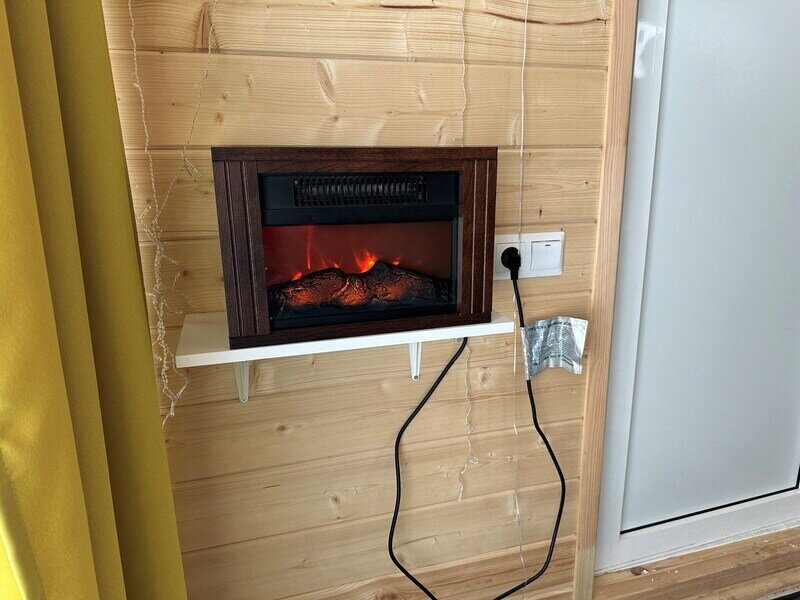 Домик с камином рассчитан для двоих гостей, комната с мини кухней (микроволновка, посуда, чайник, кружки) и с двуспальной кроватью. Ванная комната с душевой кабиной и унитазом, набор полотенец, 2 халата. У домика на улице мангал и стол, 2 стула.
