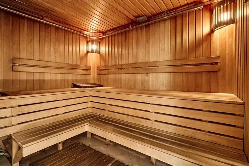 Сауна находится на 11 этаже в конце коридора, работает по записи.