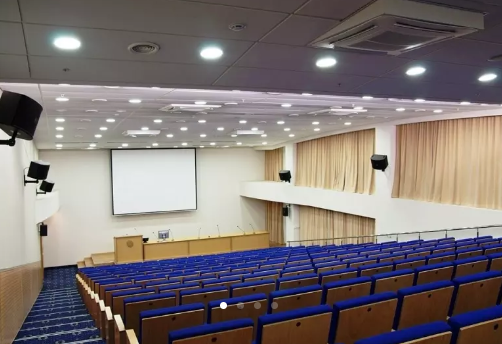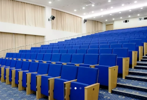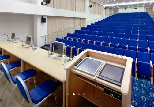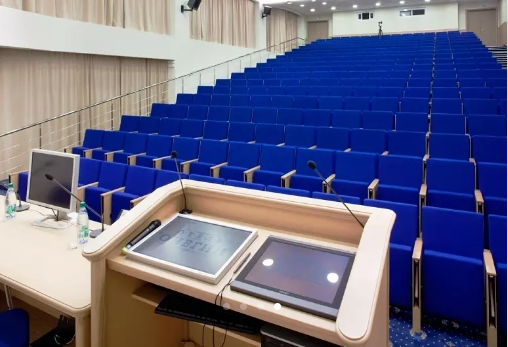 Большой конгресс-зал по типу римской аудитории со стационарными конференц-креслами и столиками для записи.