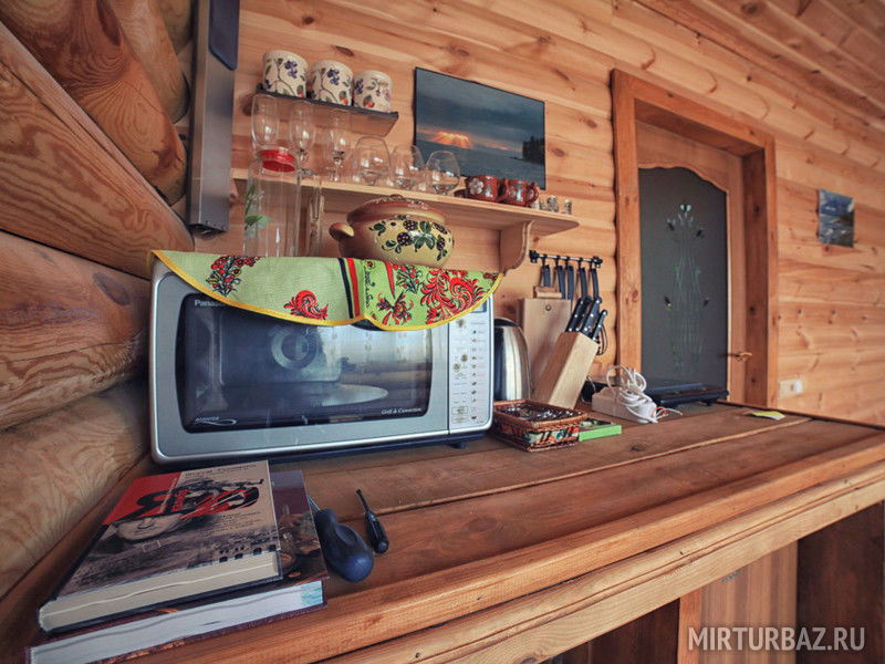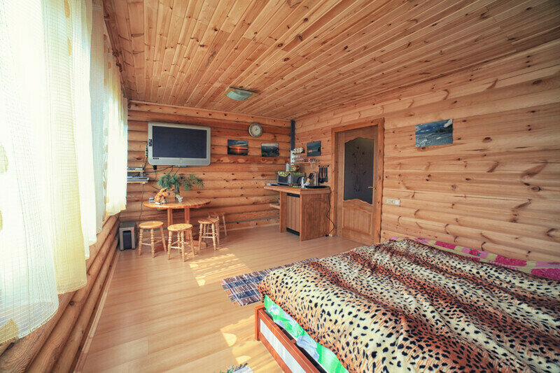Одноэтажный «Байкальский домик» оснащен традиционным внутренним убранством. В доме для удобств есть электрочайник, микроволновая печь, холодильник, электроплита, будничная утварь для готовки и приема еды, музыкальный центр, DVD, спутниковое телевидение, душевая кабинка, туалет. Для семейных пар с детьми – дополнительные детские кроватки.