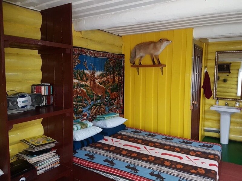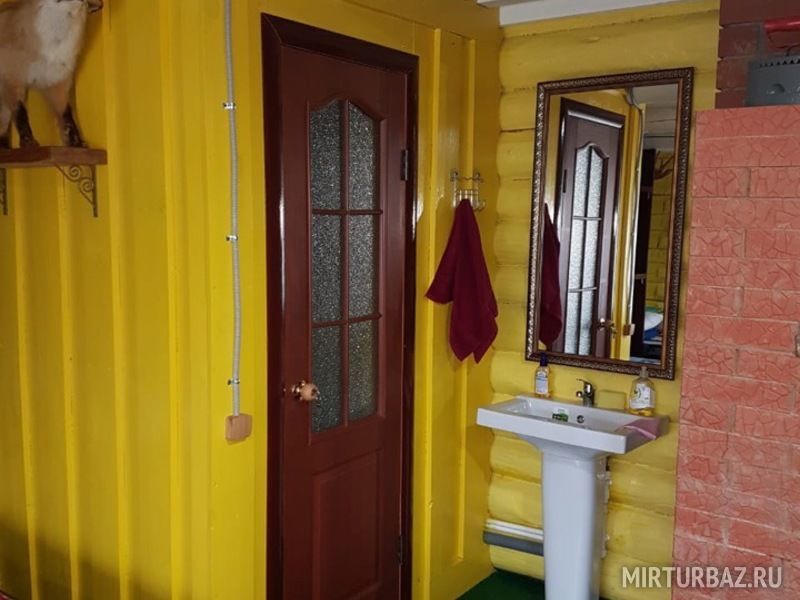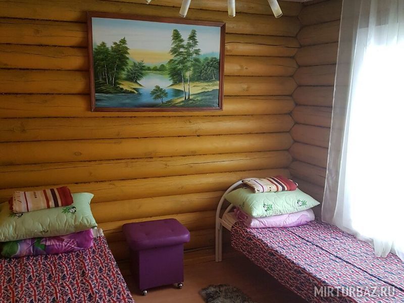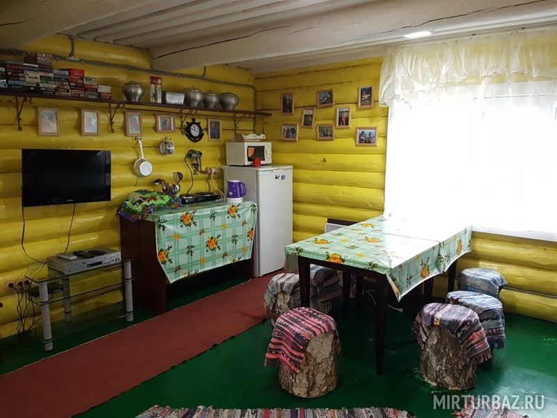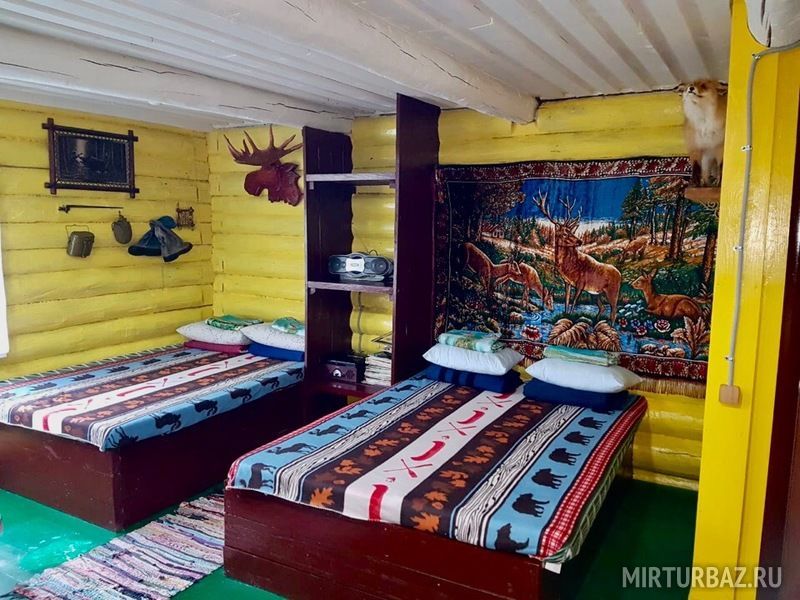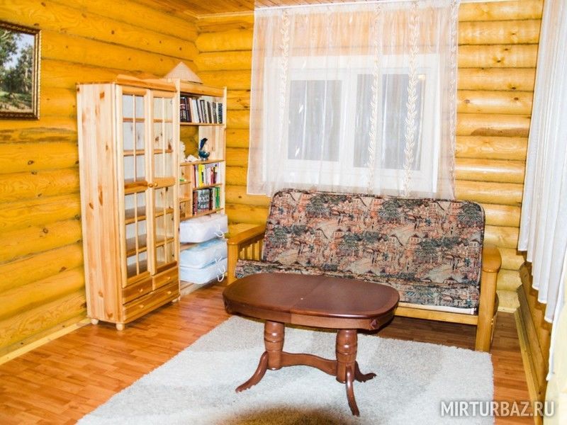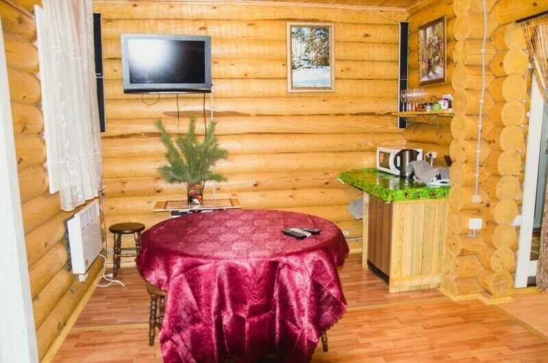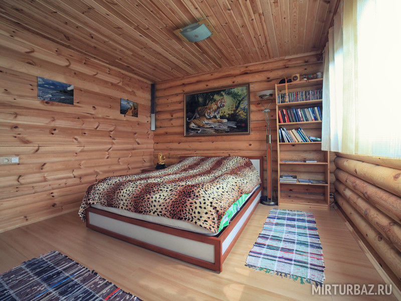 «Дом «Рыбака и Охотника» — рубленый из дерева, одноэтажный дом, с традиционным внутренним убранством. Просторная гостиная с кухонной зоной, со всем необходимым оборудованием и утварью (холодильник, микроволновая печь, электрическая плита, электрический чайник, вся кухонная утварь). Отопление — конвекторные радиаторы, спальные места – 2-е двухместные кровати. В доме: сейф для оружия, телевизор, спутниковая антенна, видеомагнитофон с видеокассетами, DVD, проигрыватель с пластинками, гитара.