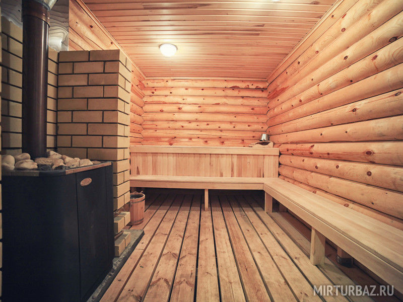 Традиционная русская баня, готовится на березовых дровах, с парилкой, помывочной и комнатой для чаяпития. Воздух в парном отделении сухой, можно «поддавать» — лить воду на каменку. На территории бани имеется веранда со столом и лавками, казан, мангал, шампура, сетка для барбекю.