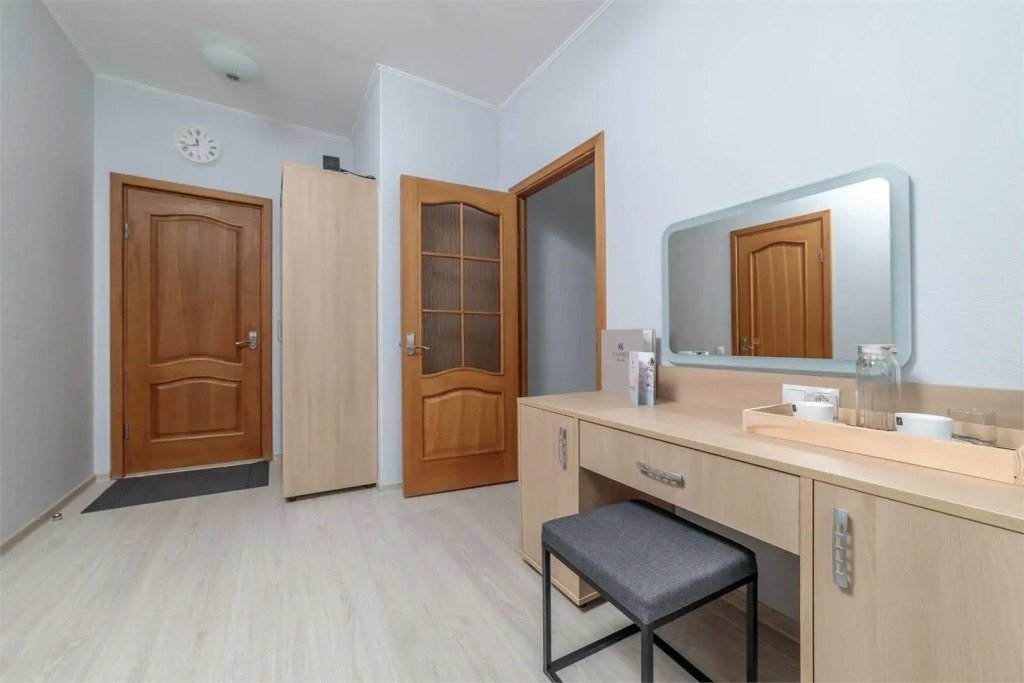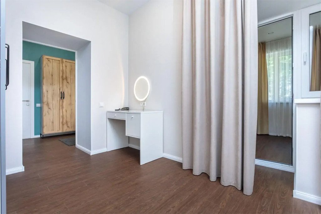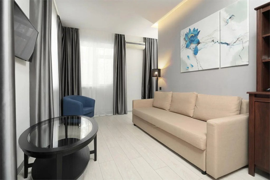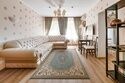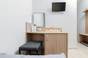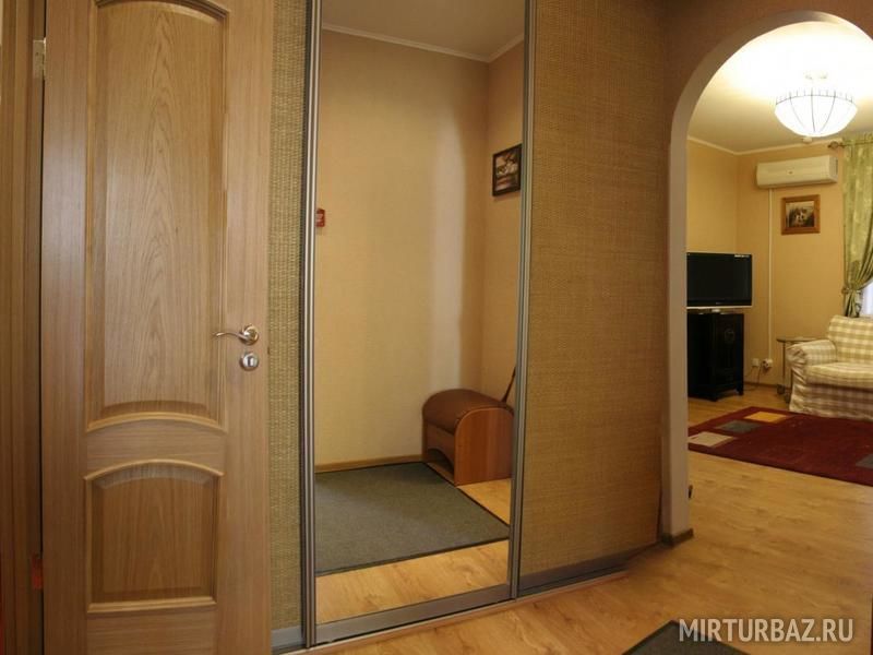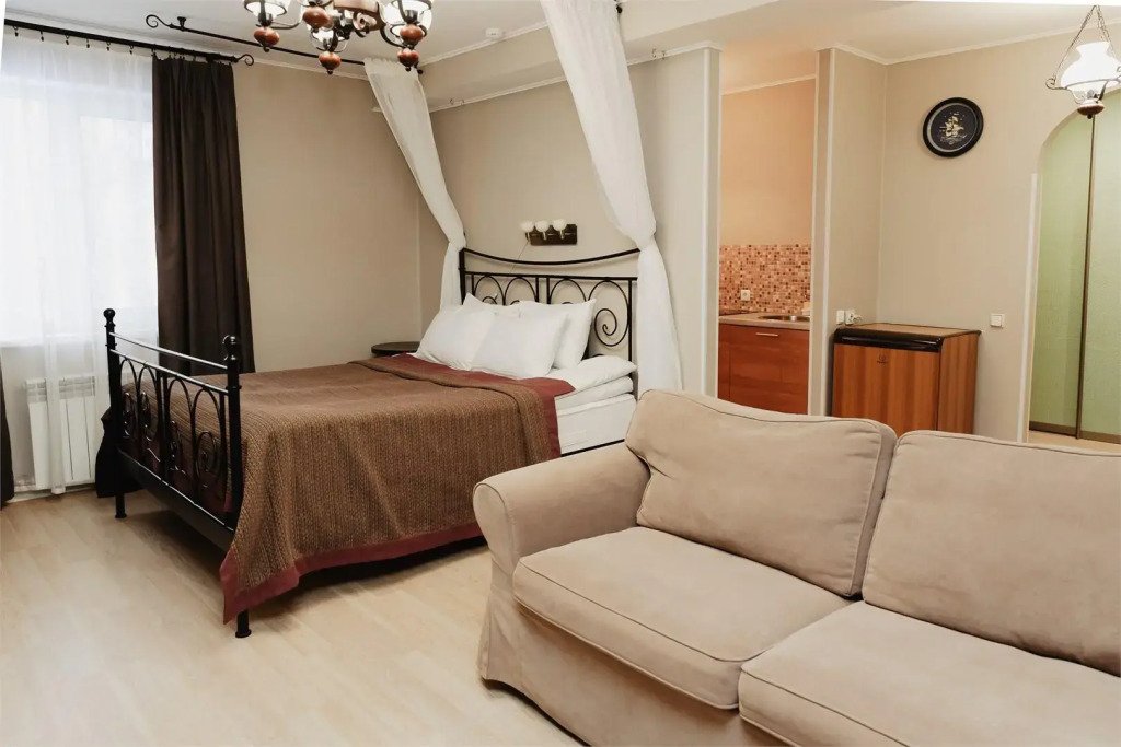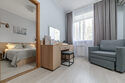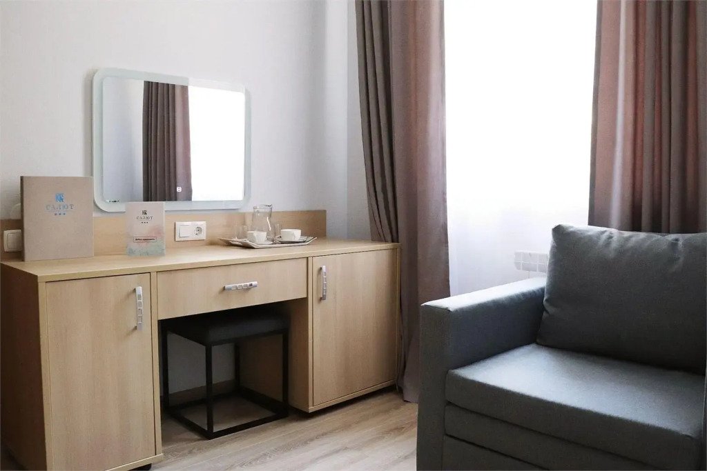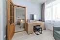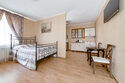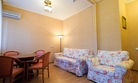 Включает в себя 2 комнаты: спальня с большой кроватью, туалетным столиком, гостиная с диваном и телевизором.