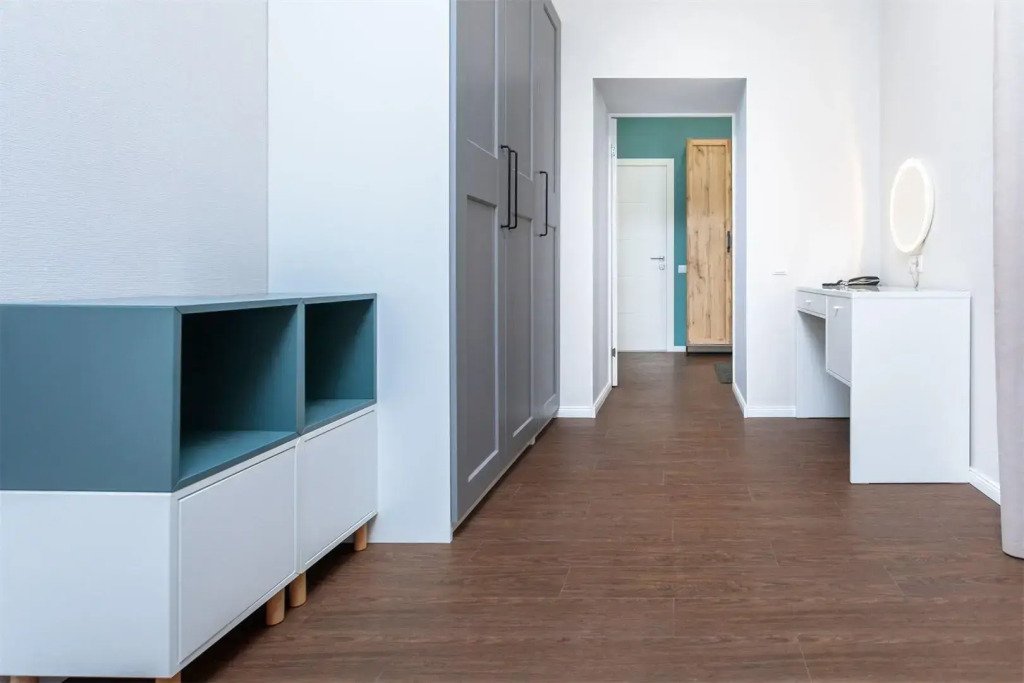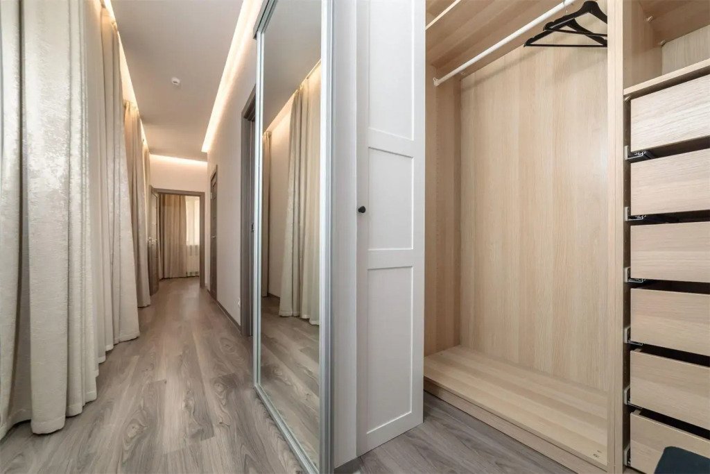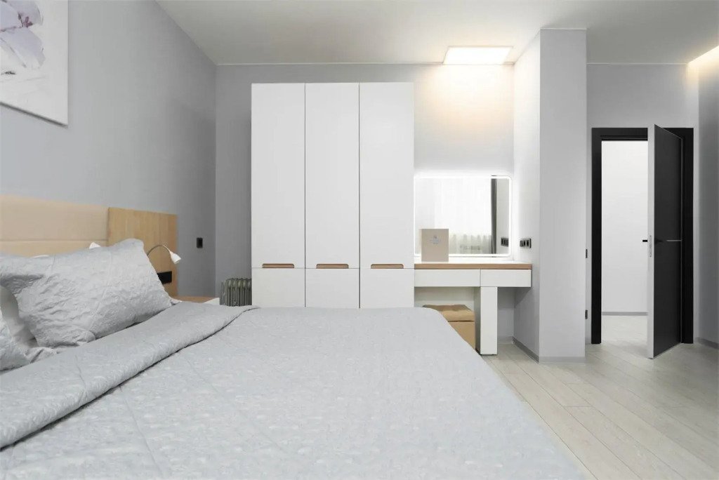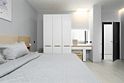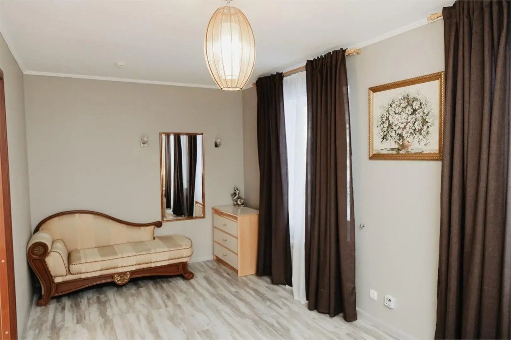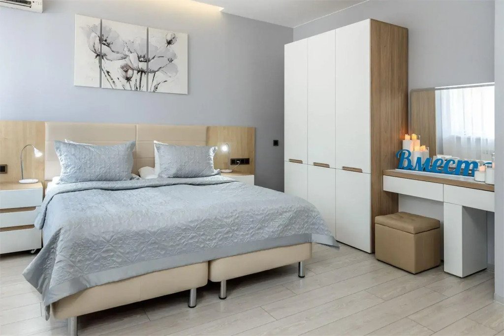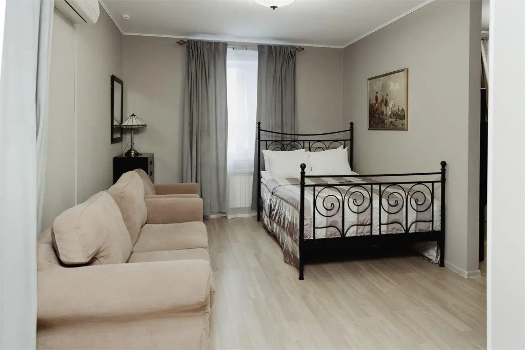 Включает в себя 2 комнаты: спальня с большой кроватью, туалетным столиком, гостиная с диваном и телевизором.